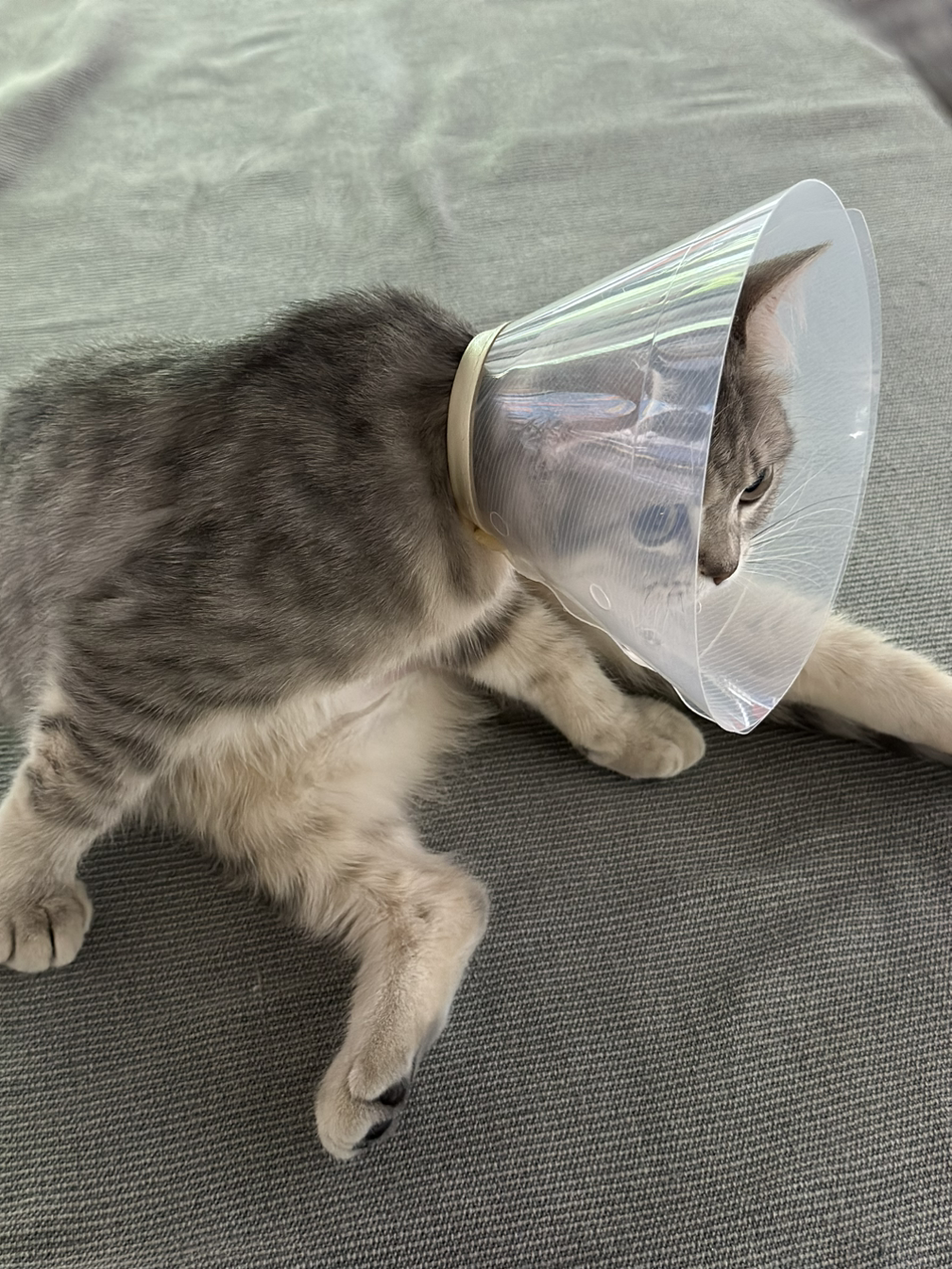 우리 집 고양이 겨울이가 중성화 수술을 받았다. 진작부터 남편이 휴가를 내야겠다고 해서 유난이라 여겼다. 수술은 15분 걸린다지만 마취 회복하는 데에 두 시간 걸린단다. 12시 넘어 집에 온 겨울이를 나는 네 시가 넘어서야 만났다. 넥카라를 하고 비척비척 걷는 겨울이는 한눈에 보아도 안쓰러웠다. 먹지 못한 배는 홀쭉해서 다리뼈가 다 드러났고, 뒷다리에 힘이 없는지 자꾸만 쓰러졌다. 암컷은 개복수술을 한다는 것도 나는 몰랐다. 포비돈액이 묻은 털 깎인 배, 실밥을 보니 남편이 오후 내 지켜봐 준 게 얼마나 다행스럽던지. 안 그러던 애가 사람 몸에 꼭 붙어서 까무룩 잠들고, 깨어있을 땐 넥카라 때문에 여기저기 부딪치면서 비틀거렸다. 점프도 못하고. 오늘 아침엔 기운을 회복해 점프도 했지만, 좋아하는 그루밍을 못해 답답한지 계속 넥카라를 핥고 뒷발로 넥카라를 긁어댔다. 급기야는 자기 혀가 닿지도 못하는데 몸 여기저기를 핥는 듯 넥카라 채로 주억거리며 핥는 시늉을 멈추지 않는다.