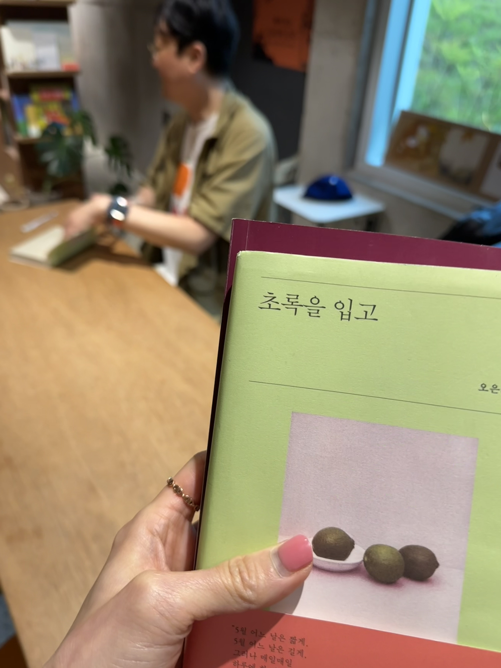 지난 일요일의 북토크는 바로 저 오은 시인님을 만나는 시간이었다. 시인을 만난 것도 반가웠고, 이야기를 듣는 것도 달가웠다. 난다 출판사의 시의적절 시리즈 <초록을 입고>에는 시, 동시, 수필, 인터뷰 등의 다양한 종류의 글과 함께 ‘적바림’이라고 해서, ‘나중에 참고하기 위하여 글로 간단히 적어둠. 또는 그런 기록’이 있었다. 시인의 사유를 엿볼 수 있어서 귀한 독서경험을 했다 싶었는데, 직접 만난 시인님은 자신의 핸드폰 메모장을 보여줘 가며 낯선 단어들을 소개해주었다. '제가 작년에 이런 메모를 썼었네요, 이 책에 나온 기역의 힘 메모가 여기 있네요.' 등등. 언제나 글 쓸 준비가 된 사람이란 걸 알 수 있었다. “이따금 쓰지만, 항상 쓴다고 생각하는 것처럼.”이라는 그의 글처럼.