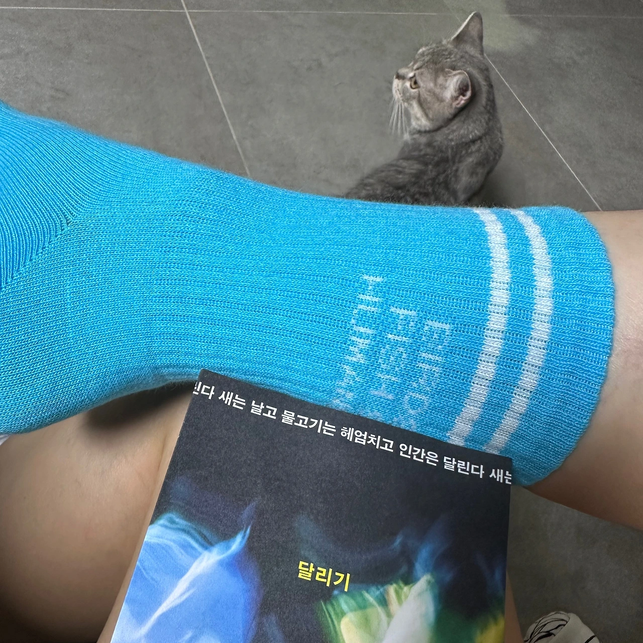 전시는 과학적인 내용도 있었고 러닝머신 위에서 달릴 수도 있었으나 내 흥미를 끌진 못했다. 오히려 문장들에 감탄했다. 류준열 배우가 마라톤하며 느낀 단상을 사진 위에 1부터 42까지 써놓은 문장들은 일단 글씨부터 너무 예뻤고, 무라카미 하루키가 쓴 달리기에 관한 문장들을 발견하는 재미가 있었다. 옥상에 이어지는 전시는 하얀 구름과 하늘이 열일해 습한 날씨임에도 불구하고 기분을 좋게 해 주었다. 내 달리기 음악을 선곡해 주겠다는 키오스크를 이리저리 눌러보다가, 달리기를 명상으로서 한다는 문장에 눈이 휘둥그레졌다. 달리기를 명상으로 할 수 있다고? 달리기를 떠올리면 땀나고 힘들다는 생각뿐이었는데 명상으로서의 달리기라니. 맞다, 달리기를 하다 보면 이런저런 생각을 하다가 기분 전환도 되고 그러는데 명상으로 즐길 수도 있겠다. 그렇다면 헉헉대는 달리기가 아니어도 된다는 얘긴가 싶어서 무척 마음에 들었다. 선곡도 궁금했지만 천천히 내 호흡으로 달리기 해도 괜찮다는 깨달음 하나를 얻은 것 같아서 뿌듯했다. 굿즈를 구경하다가 하늘색 양말 두 개를 골랐다. 전시회 슬로건인 '새는 날고 물고기는 헤엄치고 인간은 달린다'가 영어로 쓰여있었다. 달리기를 추천해 준 H에게 하나, 나에게 하나 선물. 이 양말을 신고 가뿐하게 달려봐야겠다는 다짐을 했다.