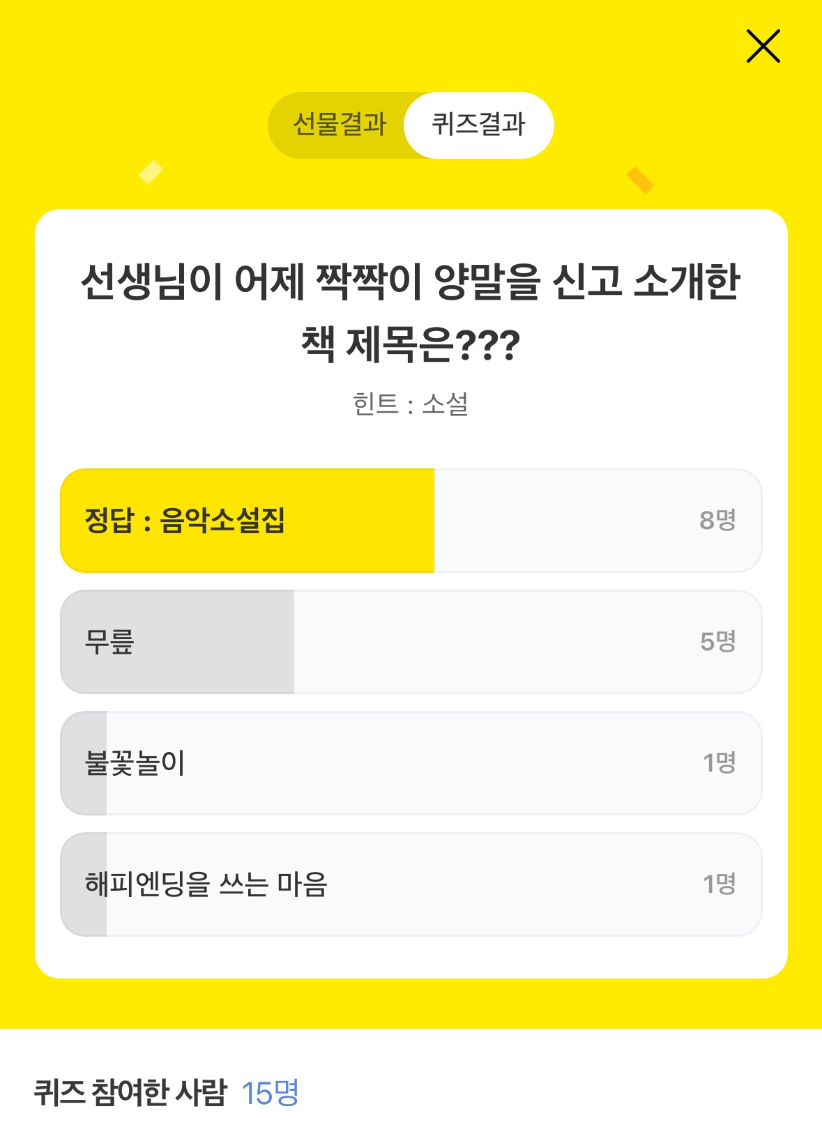 소설 속 고등학교에서 짝짝이 양말을 신은 어른들의 마음에 새삼 고마워진다. 학생들이 한 번 웃었으면 하는 마음, 삶을 허무로 마감하지 않았으면 하는 마음, 아이들이 즐겁기를 바라는 그 마음. 그 마음들을 하루 흉내 내 보았다. 내 짝짝이 양말도 아이들에게 그런 쉼을 주었을까? 주말이었던 그다음 날에는 우리 반 단체채팅방에 퀴즈를 하나 냈다. 소소한 이벤트였겠지만 아이들에게 즐거움이 되었기를 바란다.