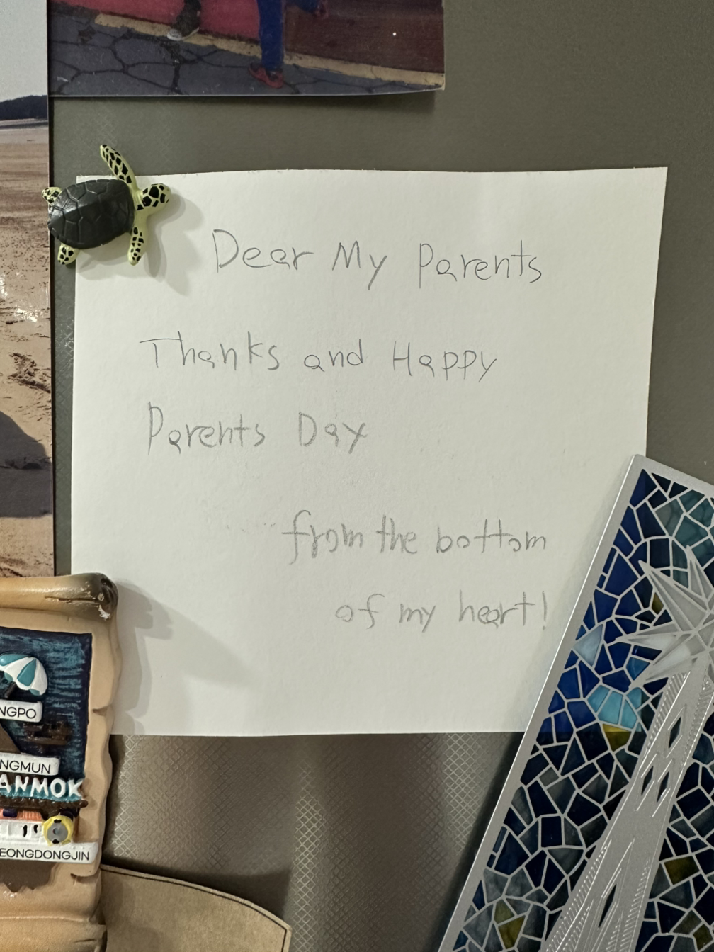 작년에도 그렇고 올해에도 나는 어버이날에 오히려 학교와 학원 선생님께 감사하는 마음을 갖게 된다. 아이들에게 꽃을 전하라고 해주시고, 카드도 쓰게 해주셔서 아들 엄마인 나도 카네이션을 받을 수 있지 않은가. 꽃을 예쁘게 꽂고 영어 카드는 소중히 냉장고에 붙여두었다. 과연 아들의 마음이 담긴 메시지인지는 모르겠다. 꽃이 바닥에 떨어져 있던 건, 겨울이가 그런 거겠지 애써 위안한다.