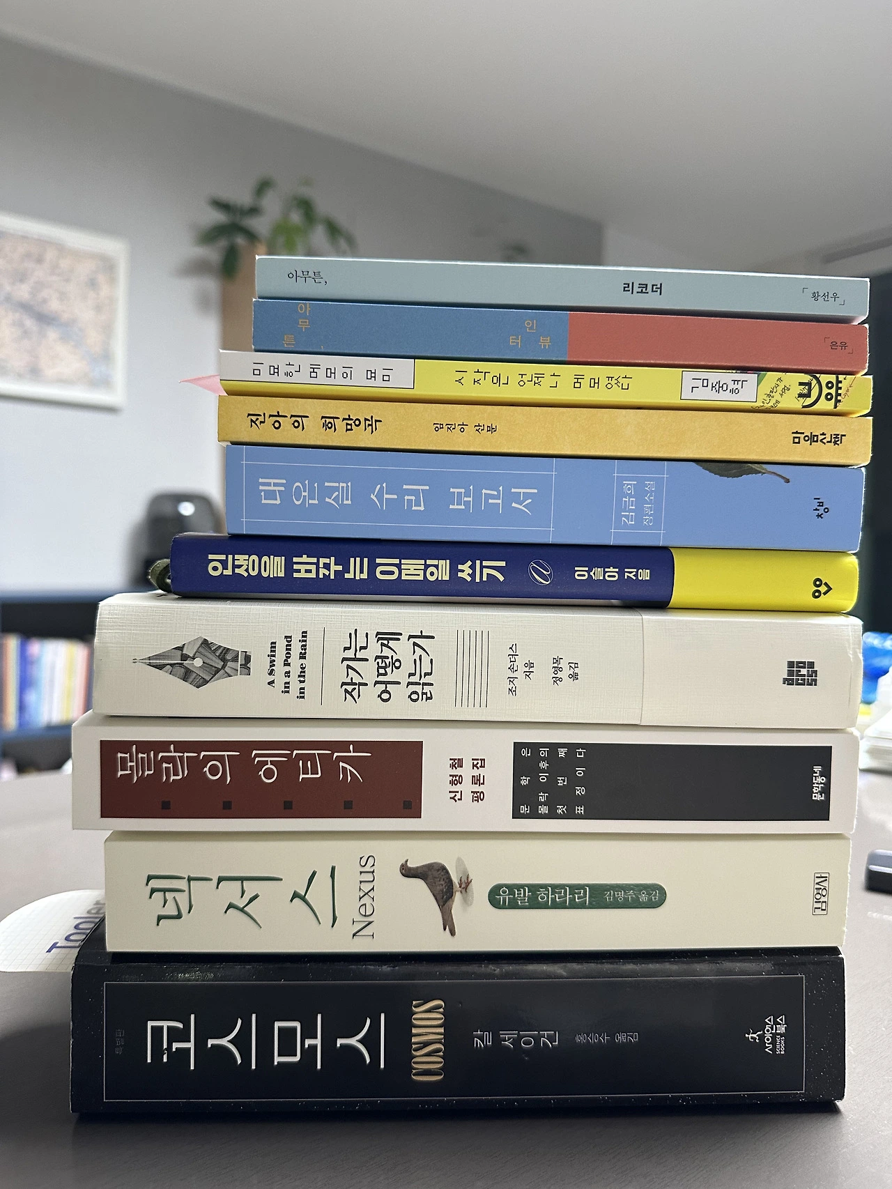 하는 문장을 만났다(겨우 50쪽에 나오는 문장이다). 9월에 읽을 책들이 어쩌면 어떤 정보를 만들어낼 수도 있겠다. 때마침 소설 쓰기에 관심이 생겼고, 유발 하라리에 의하면 인류는 '이야기'를 중심으로 발전해왔으니. <코스모스>도 우주에 대한 다양한 스토리텔링의 서사시가 아니던가. 우주 생명의 푸가, 이렇게 음악에 비유하는 장도 있으니 <아무튼, 리코더>와 <진아의 희망곡>까지 다 닿아있다고 볼 수 있다. 조금 억지를 부렸다.