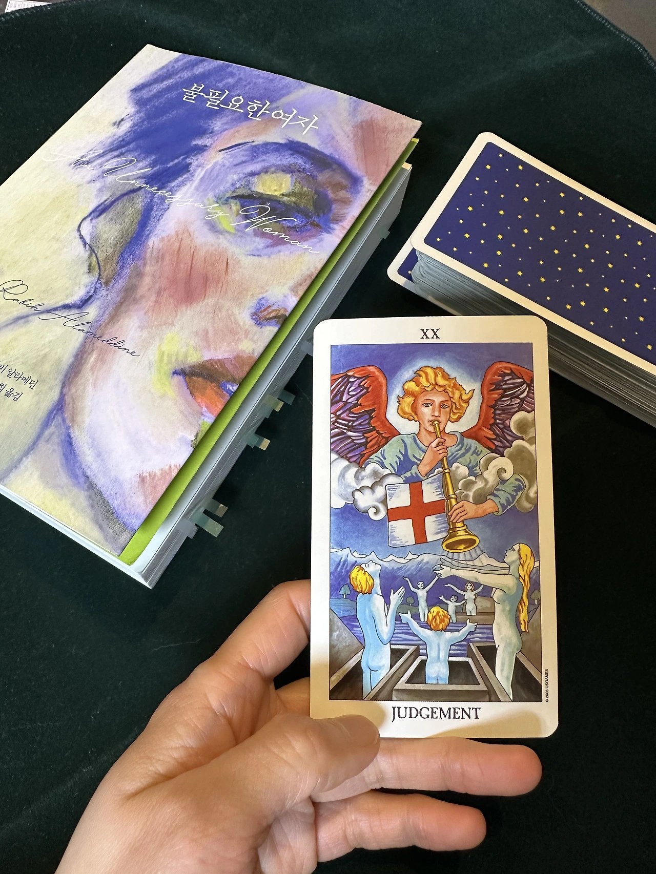 섬세한 결을 지닌 소화 님은 이다희 번역가님의 단어 선정, 문장들에 감탄해 그 부분을 짚어주었다. 모임장인 애리님은 주인공이 하는 번역이라는 작업이 곧 생명이 없던 작품을 살리는 일이라는 이야길 들려줬다. 자신만의 번역 결과물을 상자에 담아, 화장실에 두며 '관'처럼 느껴졌다는 표현이 소설 후반에 나온다. 이런 얘길 들으며 타로카드 20번의 이미지가 떠올랐다. 관에 있던 푸른 몸의 인물들이 천사의 부름에 만세를 부르며 일어서는 그림이다. 부름 혹은 구원.