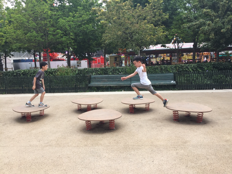 한구석에는 수동 펌프 같은 게 있었는데, 운동하던 여자분이 달려가서는 물을 마시고 가는 거다. 놀던 애들도 펌프 위 손잡이를 열~심히 돌려서 물을 틀어서는 마시고 가고.(나중엔 공원이며 놀이터에 갈 때마다 이용하였다. 물맛 괜찮아요.) 나는 가지고 있던 손수건에 물을 적셔오라고 아이들에게 시키고, 아이들 얼굴이며 목, 팔의 땀을 닦아 줬다. 아이들이 처음에는 어떻게 작동시키는지 몰라 물을 틀지 못하자, 어떤 남자아이가 대신 물을 틀어줬다. 큰아이에게 "Merci"하라고 시키자 아이도 대답을. "De rien" 그러더니 큰아이랑 둘이 서로 어색해하며 같은 놀이기구에서 놀더라. 여기 자주 와야겠다. 다른 아이들이랑도 어울리면서 말도 해보게.