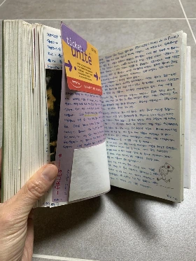 서로의 추억을 들여다보며 자신의 경험을 떠올리는 시간은 훈훈했다. 참 내가 소개한 추억의 물체는 나의 여행일기였다. 몇 달 전 동료 선생님들과 대화하다가 유럽여행 다녀오면서 그 기간 동안 기록하던 노트를 다 채워와서 뿌듯했다는 얘기를 했었다. 그분들이 보고 싶어 해서 베란다 일기장(초등학생 때 것부터 있다.) 상자에 넣어둔 것을 찾아 꺼냈다. 몇 년 만에 보는 나의 기록은 새롭게 느껴졌다. 얇지 않은 노트였는데, 거기에 여행 준비물이며 일정, 여행에 필요한 외국어 단어 몇 개, 여행 준비하면서 참고한 책에 대한 짧은 평을 써놓고 떠난 여행이었다. 비행기에 올라서부터 돌아오는 비행기 안에서까지 그 노트를 정말 꽉 채워왔다. 작은 딱풀도 가방에 넣고 다니면서 티켓이며 영수증 따위를 붙이기도 했다. 몇 년 간 잊고 있던 내 책을 보니 다시금 뿌듯해졌다. (무려 2005년에 쓴 거였다! 그 책을 채우고 났을 때에는, 그걸 누구에게도 보여주지 않다가-같이 여행을 함께 했던 친구에게도 그랬다. 친구랑 안 좋았던 감정도 담겨 있으므로- 한 분께 보여준 적이 있었는데 창피하기도 하고 머쓱했었다. 그런데 십 년도 더 지난 지금은 누가 자세히 읽을 것도 아니고 머쓱한 마음은 휘발되어 나는 정말 책을 찾은 다음날 동료 선생님들께 자랑을 했다.)