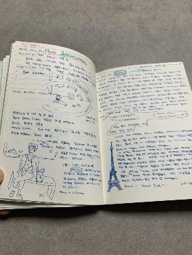 그렇게 다시 빛을 보게 된 그 책을 나는 상자에 넣지 않고, 잘 보이는 책장에 세워 두었다. 틈 나면 쓰다듬으면서 '나는 쓸 수 있는 사람이다'를 되뇌기도 했다. 그리고 물체주머니 두 번째 시간 수업마다 나만의 물체로 소개했다. 20일간의 여행이었고, 이탈리아, 오스트리아, 프랑스를 머물던 기록이었다. 프랑스 식당에서 아주머니가 써준 메뉴 이름도 있었고, 프랑스 남부 아를에서 만난 정수복 교수님과의 산책 이야기며, 교수님 필체로 성함과 당시 파리 거주하시던 집의 전화번호도 쓰여 있다. 틈틈이 끄적이던 그림도 있다. 먹었던 음식이나 커피잔은 물론이고 피렌체의 두오모를 오르며 뱅글뱅글 오르던 계단과 두오모 성당, 마흐모탕 미술관에서 모네의 그림을 감상하시던 분홍색 모자, 재킷, 바지, 가방이 우아하던 할머니 그림까지. 지금 생각해도 이걸 다 어떻게 그리고, 이런 생각을 그때 언제 했지 싶다. (맞다. 그때 우리의 여행은 한껏 게을렀다. 계획하던 아시시도 못 갔고, 틈만 나면 카페를 찾아 앉곤 했다. 그런데 그 시간들이 참 좋았다.) 어쨌거나 아이들 앞에서 그 증거물을 보이면서, ‘나는 이 책 덕분에 뭔가를 쓸 수 있는 사람일 거라는 믿음이 있다. 그래서 나에게는 소중하다. ‘ 이런 설명을 했다.