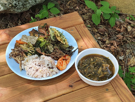취재를 도와준 산림청 직원들과 반나절 동안 하이라이트 코스를 걸었다. 마을 어르신에게 전쟁 이야기를 많이 들었고, 당시의 긴장감과 분단 상황의 엄중함을 강조해 기사를 썼다. 정작 길을 걸으며 인상적이었던 건 무구한 자연과 사발처럼 생긴 신기한 지형이었다. 마을 주민이 준비해준 숲밥도 잊지 못할 맛이었다. 펀치볼의 명물 시래기를 비롯해 머위·우산나물·두릅까지 17가지 찬을 맛봤다. 원래 나물만 보면 환장하는데(콩나물만 빼고), 평소 맛보기 힘든 귀한 산나물이 잔뜩 깔리니 걸신이 들린 듯 밥을 먹었다. 향긋한 숲이 통째로 몸속으로 들어온 기분이었다.