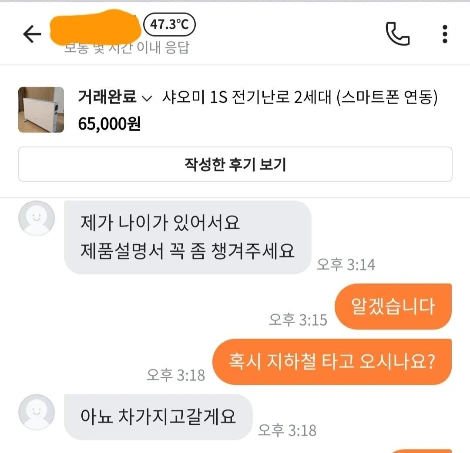 당근마켓에는 유별난 사람만 모인 것 같다고 생각했으나 꼭 그런 건 아니었다. 나도 충분히 이상하고 밥맛 없는 거래자가 될 수 있다는 걸 깨우친 순간이 있었다. 지난겨울, 샤오미 전기난로를 팔았다. 하마처럼 전기요금을 잡아먹는 녀석이어서 산 지 두 달만에 내놓았다. 금방 입질이 왔다. 유난히 말줄임표를 많이 쓰던 상대는 조심스럽게 네고를 요청했고 본인이 나이가 좀 있으니 설명서를 꼭 챙겨달라고 했다. 성가셨다. 샤오미 제품 처음 써보시나. 작동법이 단순해서 설명서는 따로 없고 거래하면서 간단히 설명드리겠다고 했다. 그리고 5000원을 깎아줬다.
