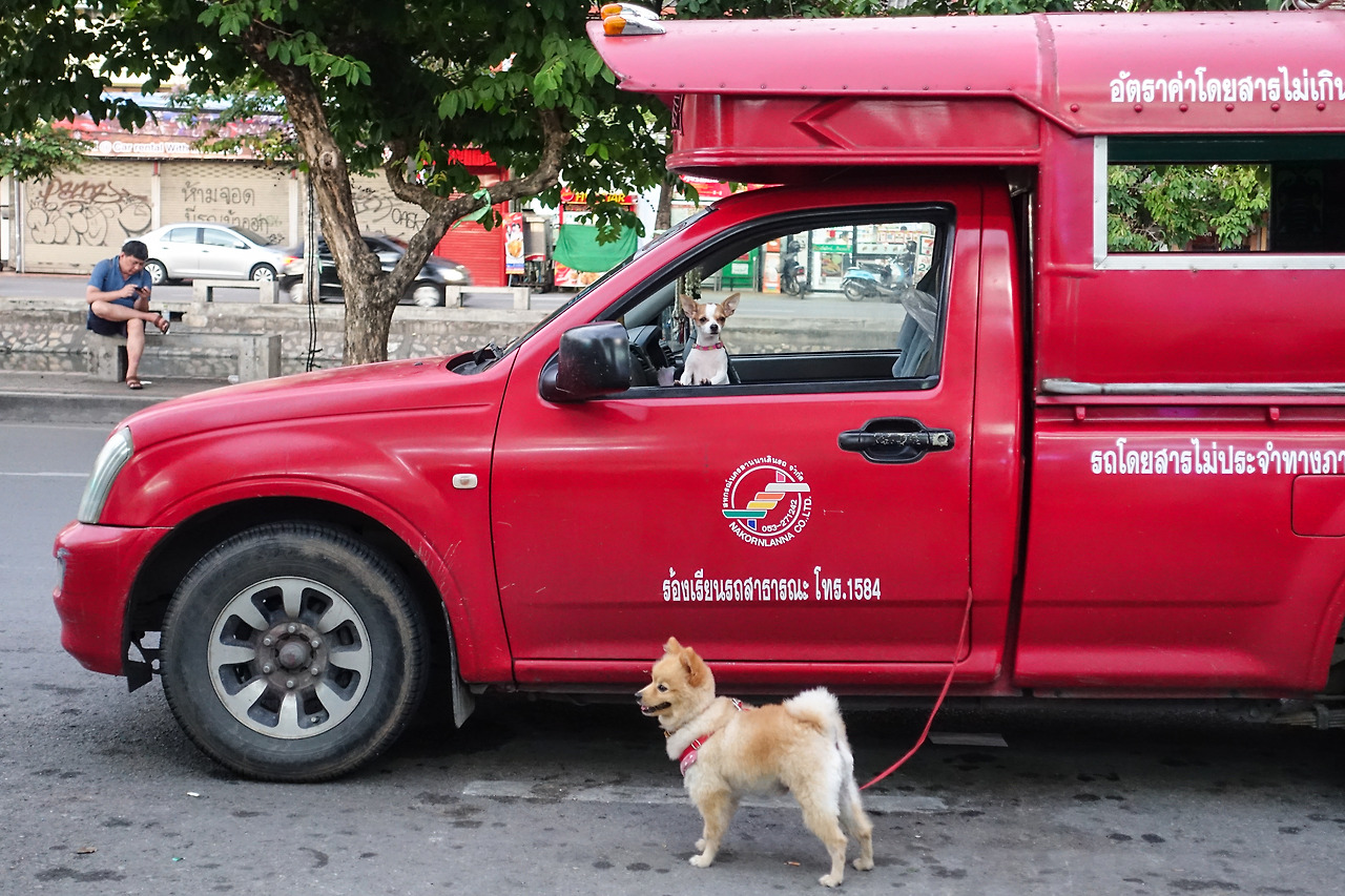 픽업트럭을 개조한 택시 '썽태우'. 사람은 안 태우고 개만 태우고 있네.
