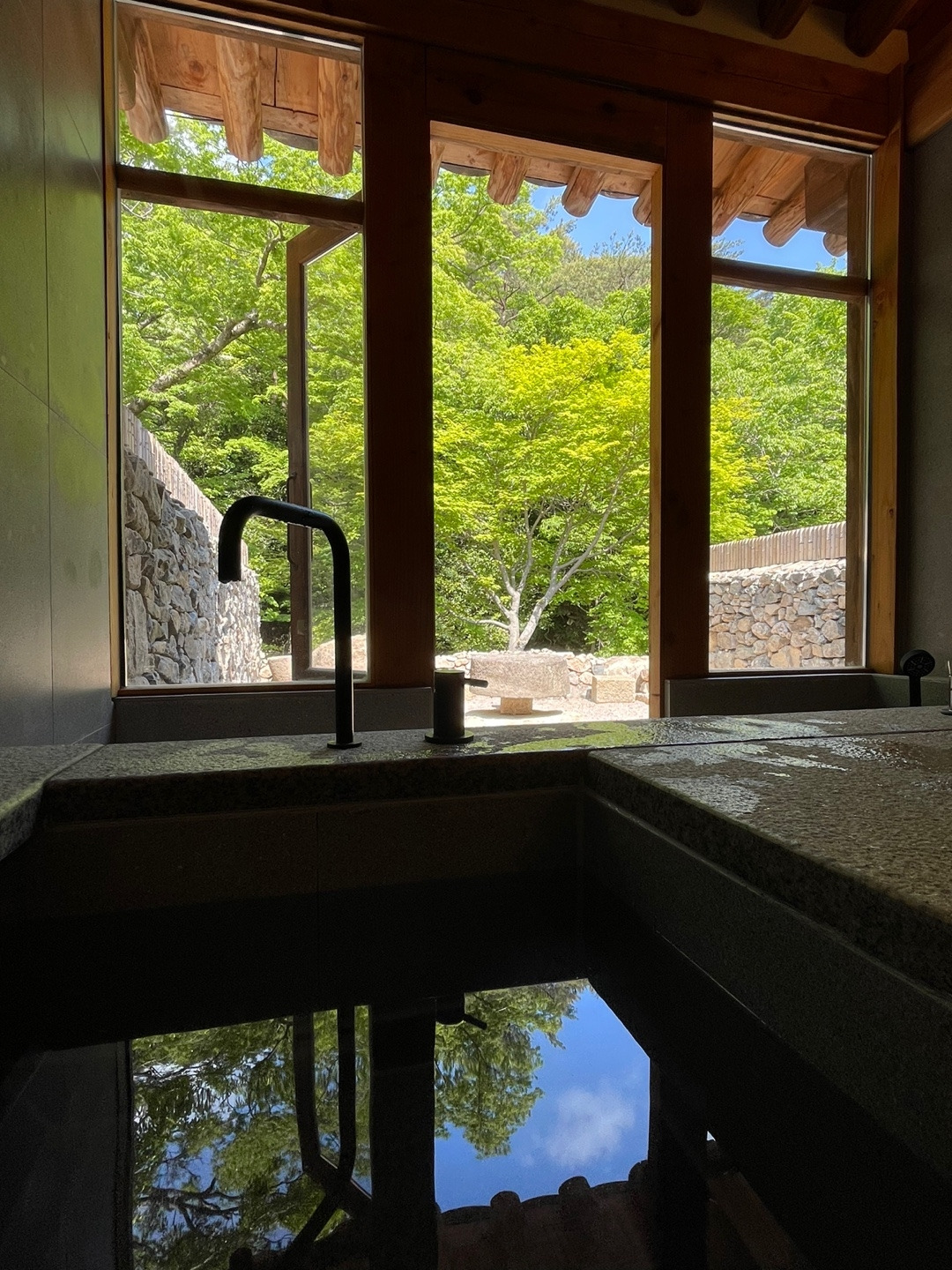 유선관에 새로 생긴 시설도 있다. 바로 스파. 한옥 안에 두 명씩 이용할 수 있는 욕조가 있는데 계곡 전망이 기막히다. 아무도 지나다닐 수 없는 방향으로 문을 내서 물소리, 새소리 들으며 반신욕을 한다. 겨울에는 시원한 바람 쐬면서 노천욕의 기분을 만끽했다. 5월에는 눈부신 신록을 보는 게 좋았다. 몸이 뜨거워지면 전실로 나가서 자연인처럼 팔을 벌리고 바람을 쐤다(진짜 아무도 못 봤겠지?). 스마트폰으로 ‘스파 음악’을 찾아 들으며 아내와 키득거리기도 했다. 일본 료칸이나 발리의 마사지숍에 온 기본이 들었다.
