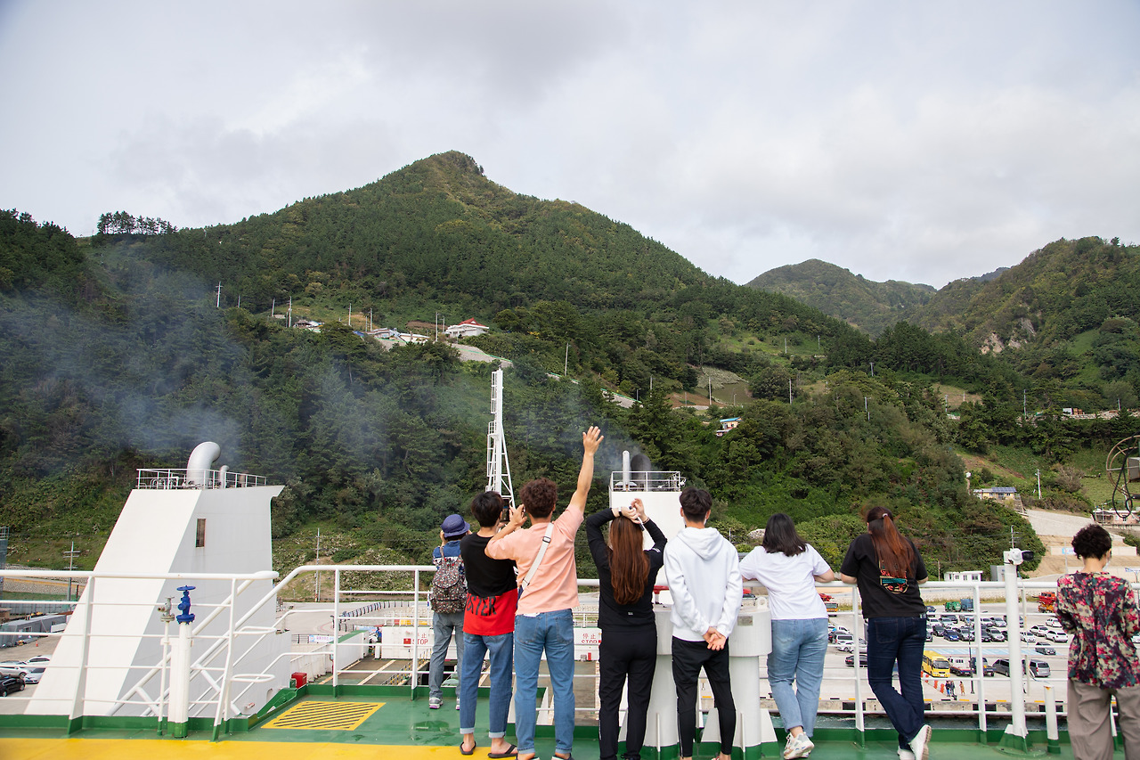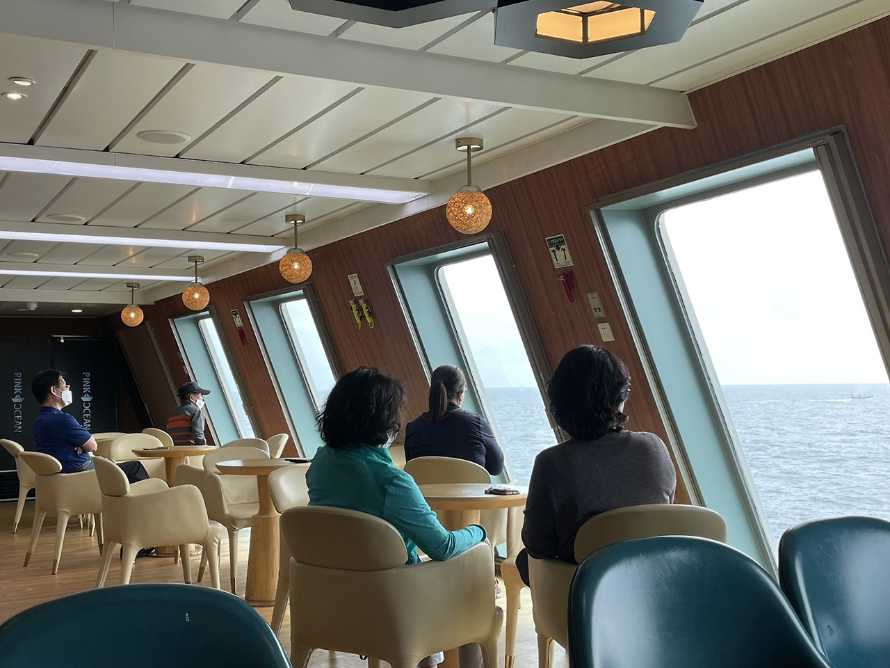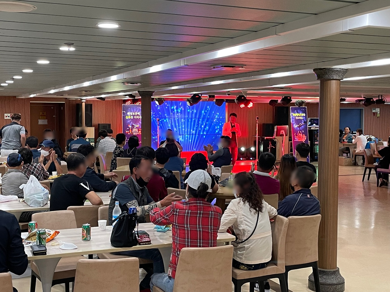 방을 나와 배를 구경했다. 매점도 있고 식당도 있었다. 갑판에서 바닷바람을 쐴 수도 있었다. 식당에서는 트로트 가수의 공연이 펼쳐졌다. 밴드 연주가 아니라 노래방 기계 반주에 맞춰 노래를 했지만 어르신들은 어깨를 들썩이고 손뼉치면서 좋아했다. 한국에서 가장 멀고도 이국적인 동쪽 섬으로 가는 중국 배에서 지극히 한국적인 문화를 마주하니 혼란스러웠다.
