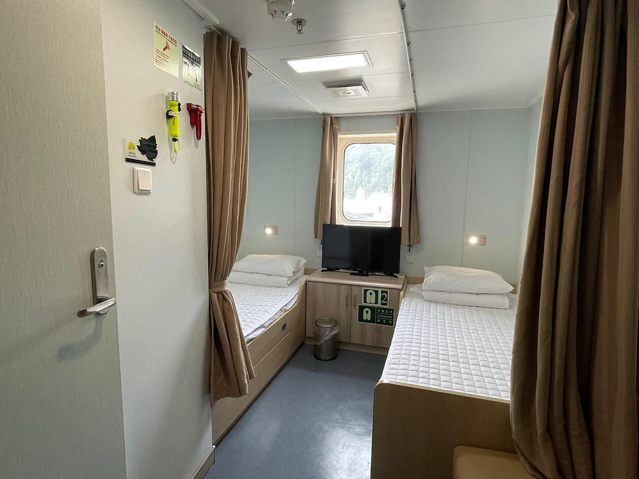 오후 11시, 발열 체크를 하고 배에 올랐다. 엘리베이터를 타고 8층 선실로 올라갔다. 2인실 선실에는 깨끗한 침구가 깔린 침대가 있었고 온수가 나오는 화장실도 있었다. ‘바다 위 호텔’로 불리는 럭셔리 크루즈가 아니어서 기대를 안 했는데 의외로 쾌적했다.