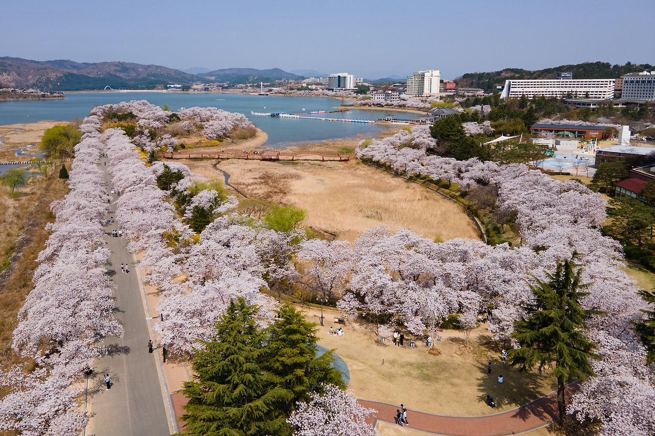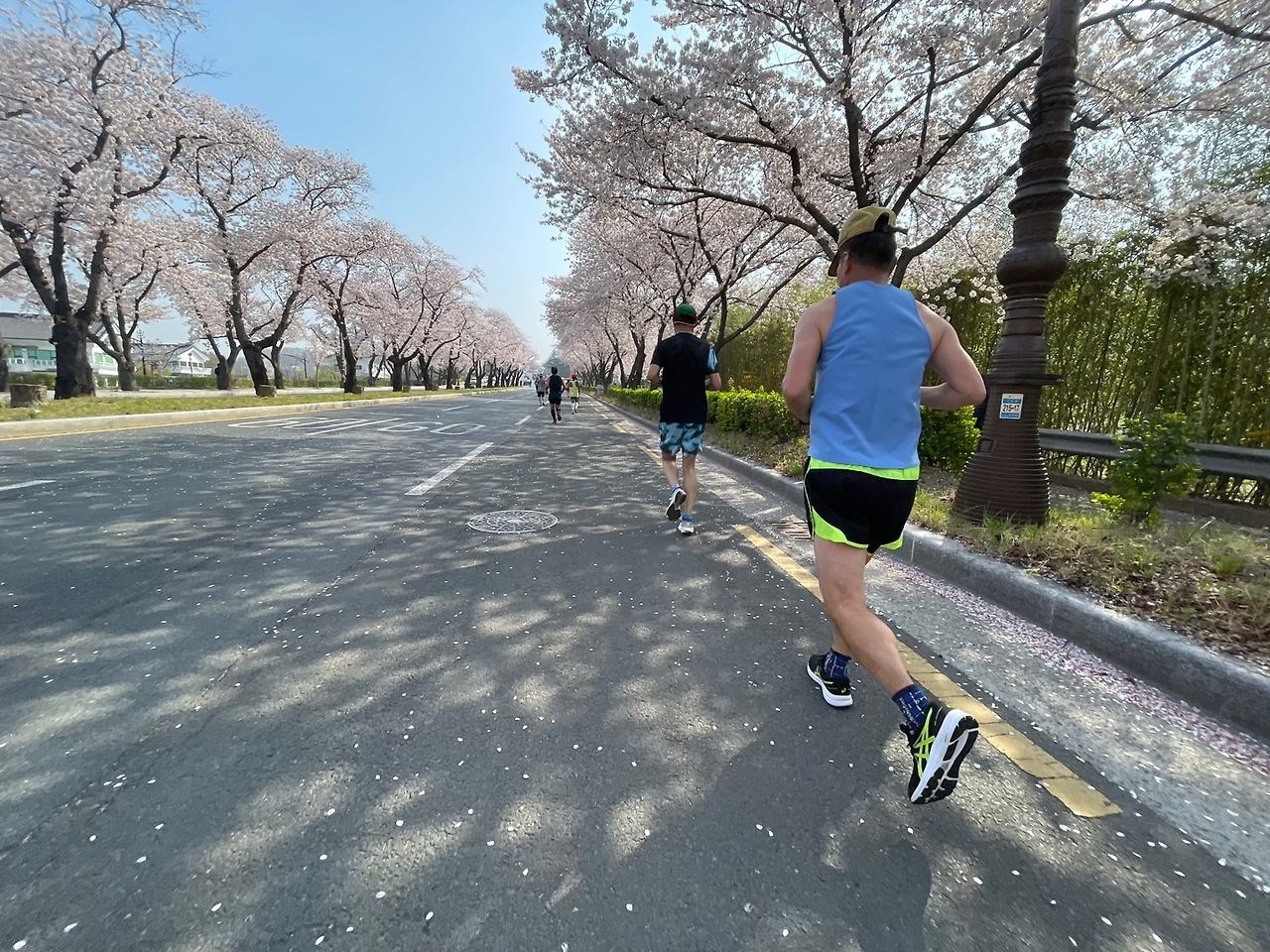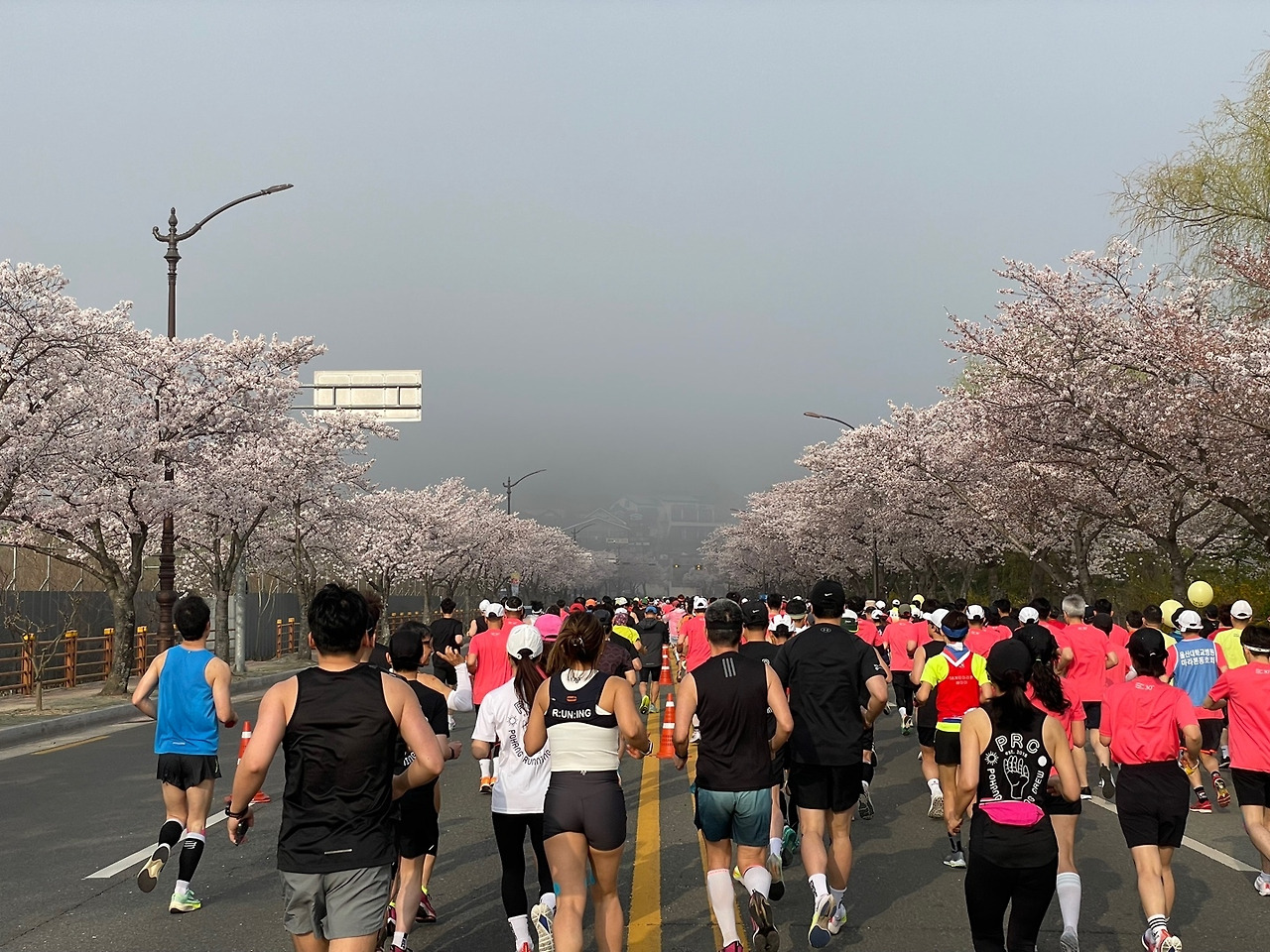 벚꽃마라톤답게 달리면서 벚꽃은 원 없이 봤다. 산책하면서 차분하게 꽃을 감상하거나 꽃밭에 돗자리를 깔고 앉아서 피크닉을 즐길 때와는 다른 차원이었다. 그러니까 순천에서도 느꼈던 건데, 빠르게 벚나무 아래를 달리니 꽃의 생김새는 자세히 볼 수 없지만 느린 셔터 속도로 사진을 찍으면 사물이 흐리고 번진 결과물을 얻는 것처럼 뭔가 몽환적인 이미지로 그 풍경이 가슴에 남는다. 꽃비 맞으며 달리다가 입속으로 꽃잎이 들어오기도 했는데 씹어보니 달큼하더라. 달리면서 꽃도 먹는 마라톤이라니.