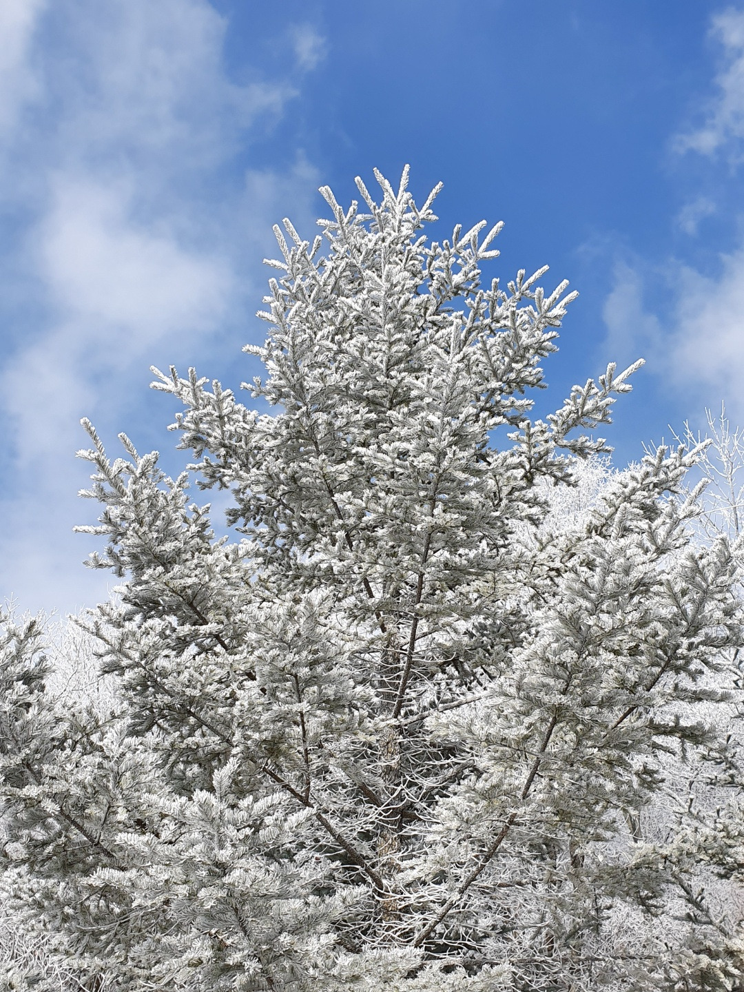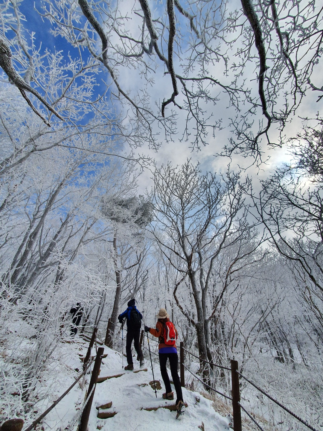 해발 1000m라는 것을 산도 알고 있었을까. 신기하게도 쉼터 위쪽부터 상고대가 보이기 시작했다. 자, 여기서 상고대가 뭔 말인지 잠깐 TMI 타임. 상고대는 상당히 고고한 대학교 이름도 아니고, 고산지대에서 날씨를 관측하는 기상대도 아니다. 나도 처음 들었을 때 한자인 줄 알았는데 순우리말이다. 서리가 나무에 얼어붙은 걸 말한다. 일교차가 큰 고산지대에서나 볼 수 있는 게 상고대다. 한자로는 수빙(樹氷)이나 무빙(霧氷)이라 쓴다고 위키피디아에 나와 있다. 그러니까 눈이 쌓여서 나무에 덮인 게 아니다. 그건 그냥 눈이지.