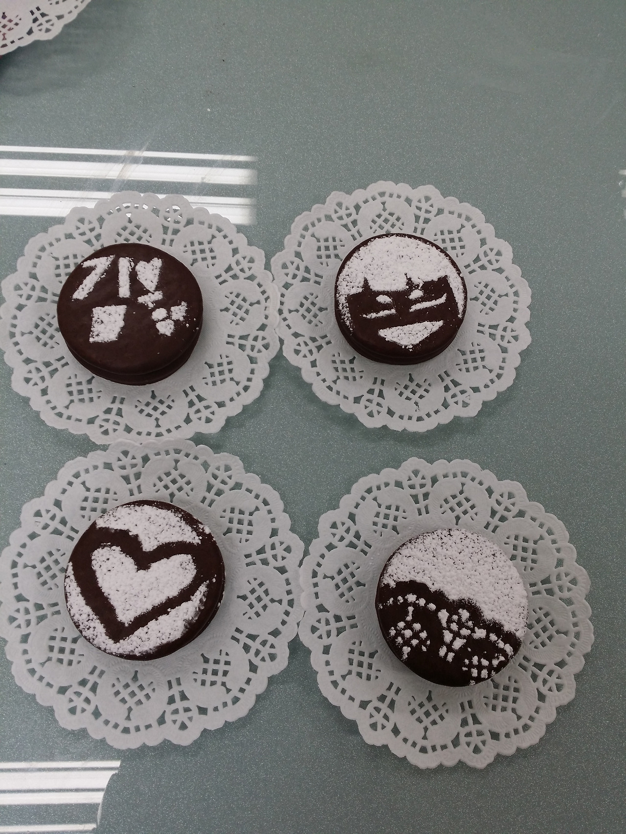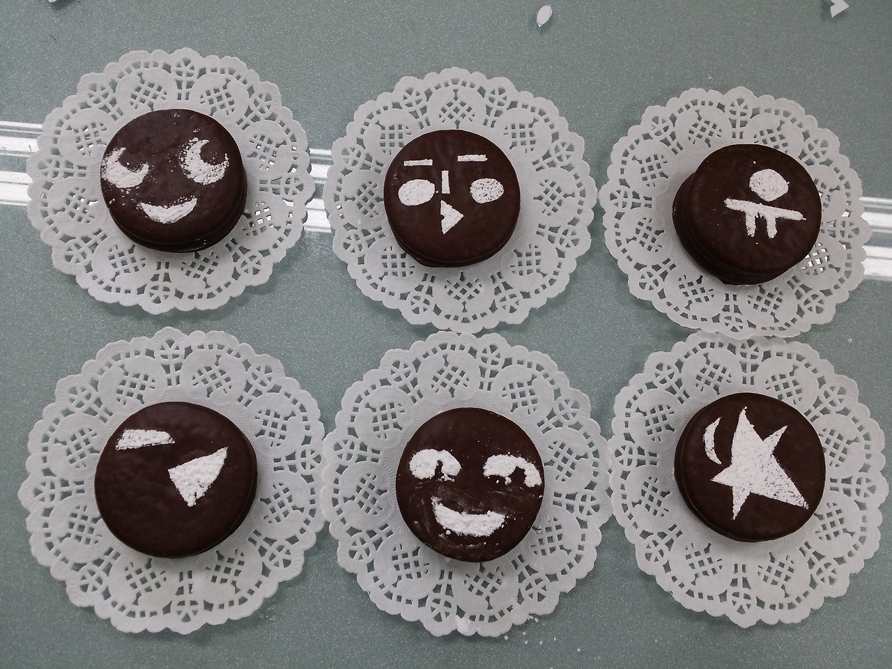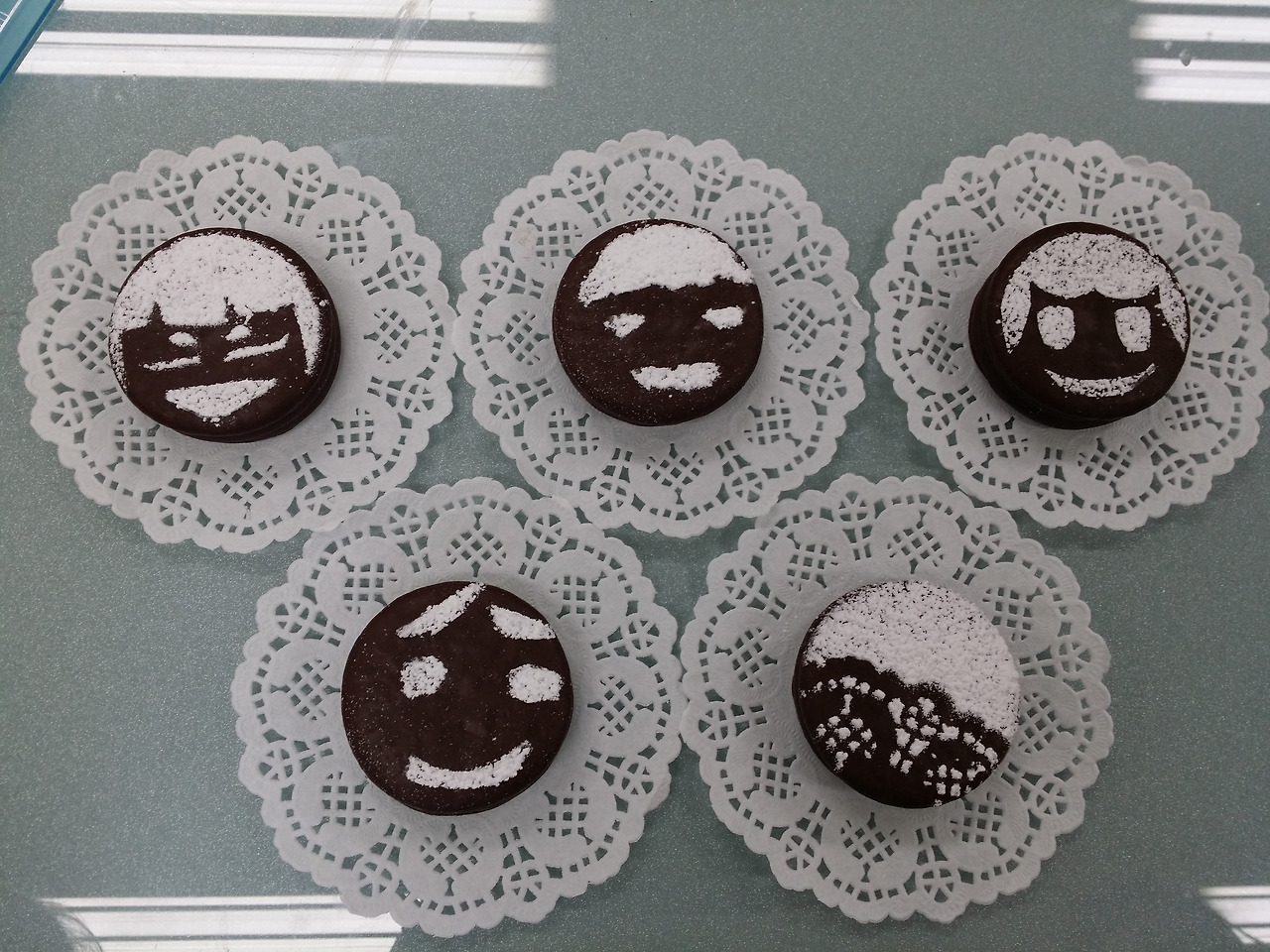 스텐실은 공판화의 일종으로, 종이나 OHP필름에 구멍을 뚫고, 그 구멍으로 잉크를 밀어넣어 찍는다. 이 수업에서는 판을 만든 후 쵸코파이에 얹고, 슈가 파우더를 채로 뿌리면 된다. 검은 파이에 흰 슈가파우더로 찍는 셈이다.