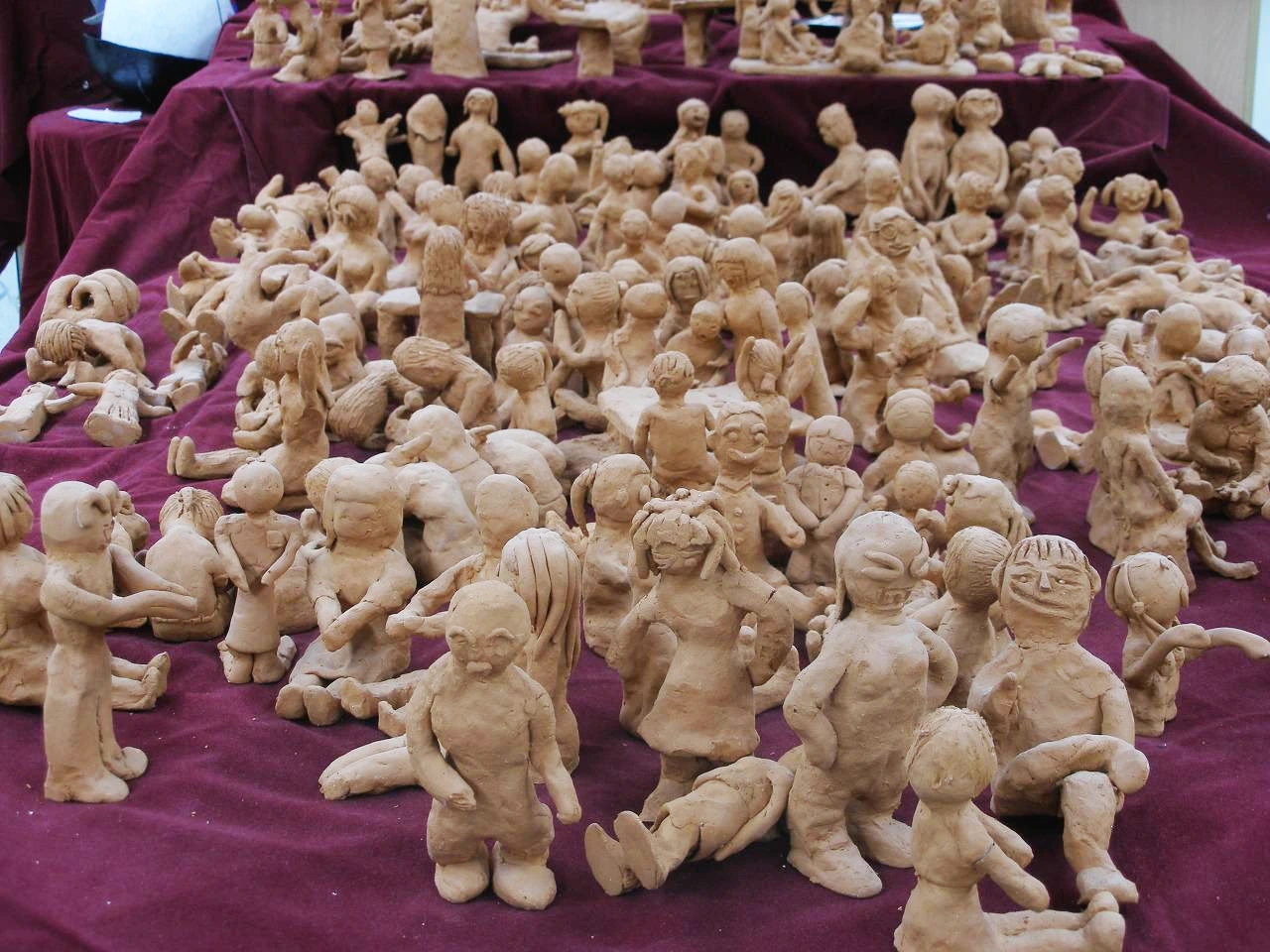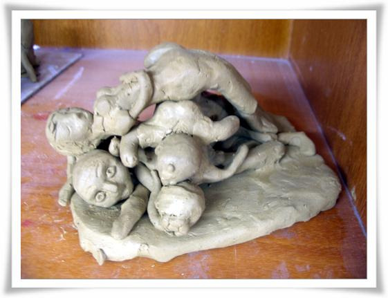 두 번째 시간에는 흙을 나누어 주고, 만들기를 시작한다. 이때 가장 중요한 것은 서로의 느낌, 어떤 장면에서 가장 즐거웠는가 등의 분위기가 표현되게 하는 것이다. 서로 놀이할 때의 느낌을 공유하고, 작품의 크기를 비롯해서 전체 분위기를 조율하는 것은 필수다. 섬세한 것보다 마치 삼국시대의 토우를 만들듯이 즉흥적으로, 놀이했던 느낌을 최대한 살리면서 만들어야 한다. 이렇게 각자 한 개씩 만들고 나면 모아서 군상으로 만든다. (2주 동안 수업을 한 것 같은 기억이 있는데, 이 글을 쓰면서 자료를 찾아보니 한 주, 단 두 시간만에 끝낸 수업이었다. 그런데, 아이들은 그 짧은 시간에 어떻게 이렇게 잘 만들었지?)