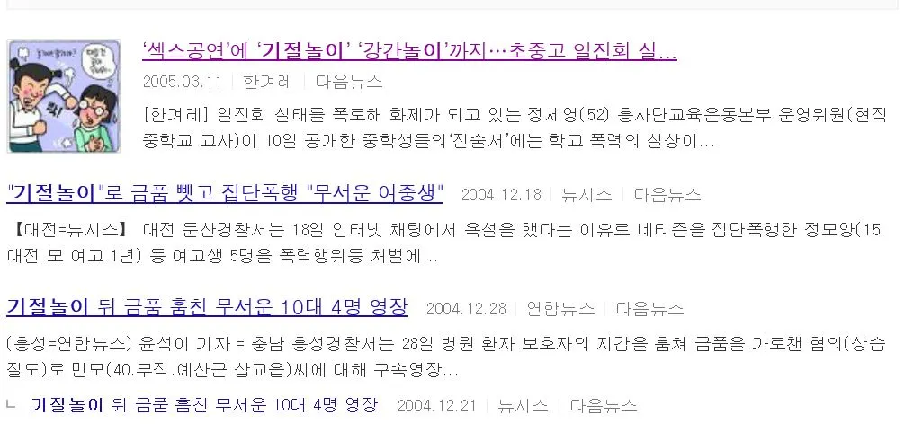 물론 기절놀이는 일진들이 일반 학생들을 괴롭힐때 자주 사용한 폭력 중 하나였다. 신문기사 제목에서 보듯 목숨을 잃은 학생들도 있었으니 놀이라는 미명하에 가해진 잔인한 폭력이었던 것이다.
