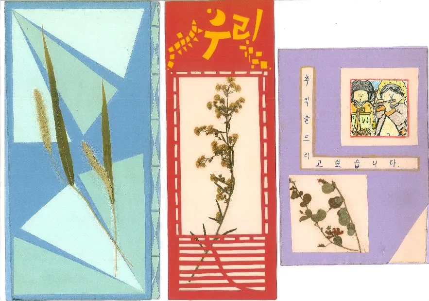 식물 채집을 생각한다면 2학기 보다는 1학기에 진행하는 것이 좋다. 왜냐하면 왜냐하면 이 학기 때는 들풀, 꽃들이 씨앗을 맺느라 서서히 말라가기 시작하기 때문이다. 위의 카드 만들기 작품들은 2학기에 진행한 것들이지만 여름 방학 과제로 식물 채집 숙제를 내준 터였다. 식물 채집 숙제를 내주면서 아이들이 자신이 채집한 식물의 이름을 알아오도록 했다. 물론 많은 아이들이 이름을 알아오지 못했지만, 수업을 하면서 내가 알고 있는 식물의 이름은 알려주었다. 식물은 물기 없이 바짝 말려야 한다. 그렇지 않으면 완성 후 곰팡이가 생기는 낭패를 보기 쉽다.