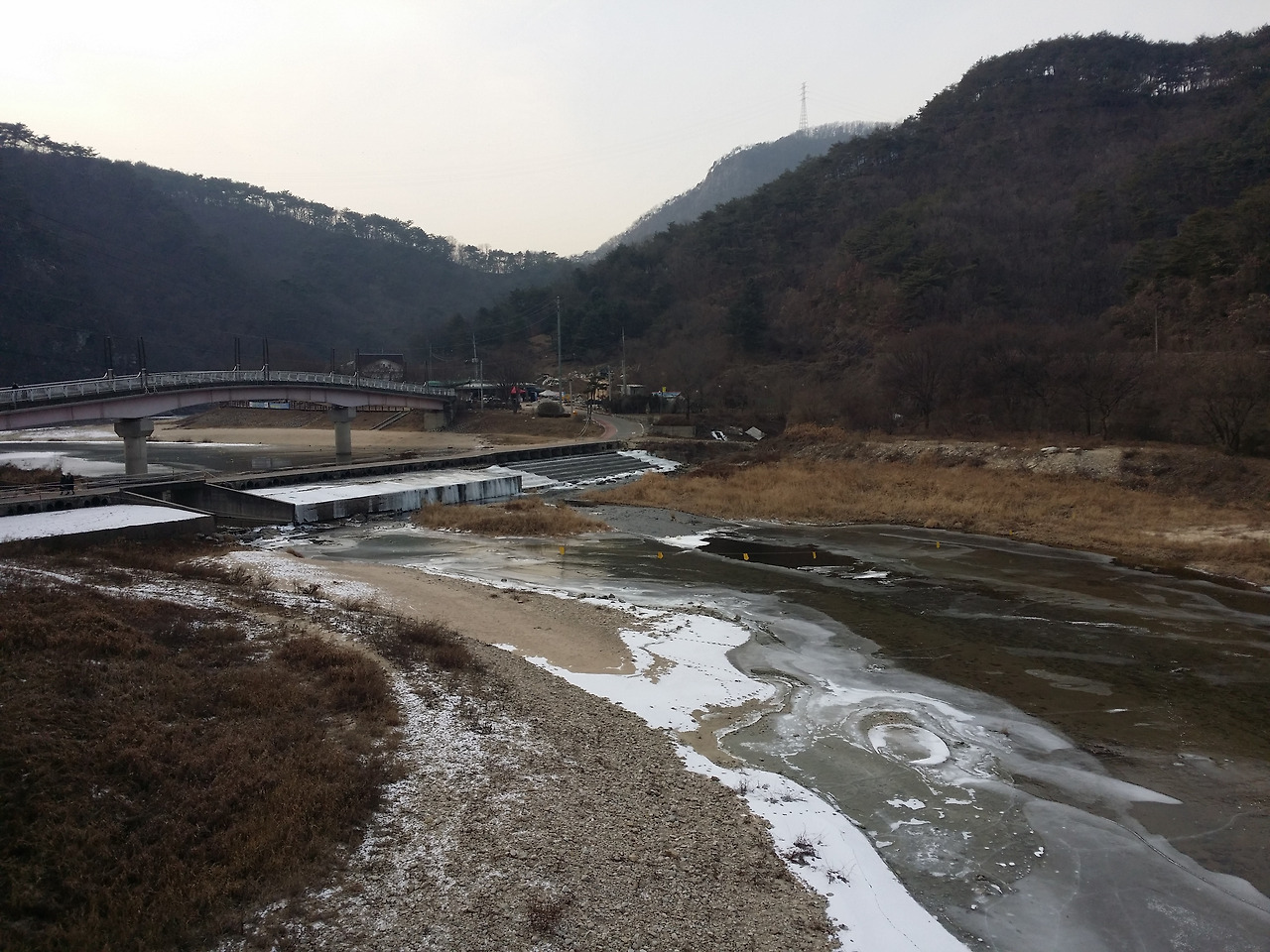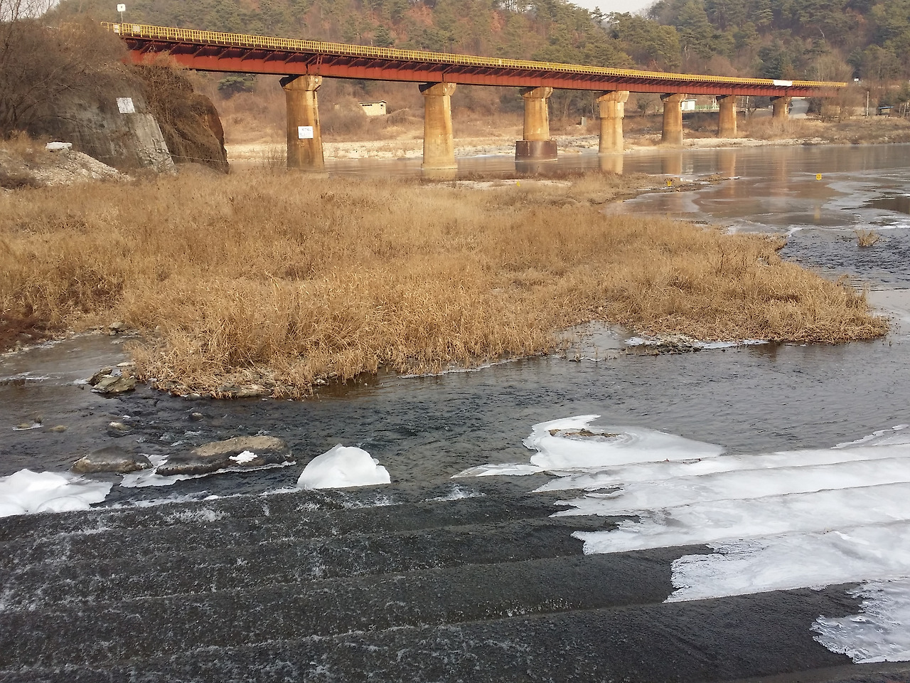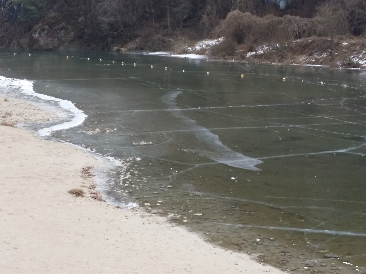 목적지에 도착했다고 해도, 내가 그곳에서 남들처럼 즐기지 못했다고 해도 절망할 것은 없다. 어차피 인생이란 게 뜻대로 되는 일이 몇 개나 있었던가,라고 스스로를 위로하면서 출렁다리 대신 섬강의 얼음 낀 풍경을 즐기기로 했다. 얼음 아래로 제법 깊어 보이는 시퍼런 강물이 비쳤다. 얼음은 쩍쩍 금이 가있는데, 제 스스로 만들어낸 선인지 누군가 돌을 던져 만들어낸 선인지, 참으로 아름다운 얼음 계곡 풍경이었다.