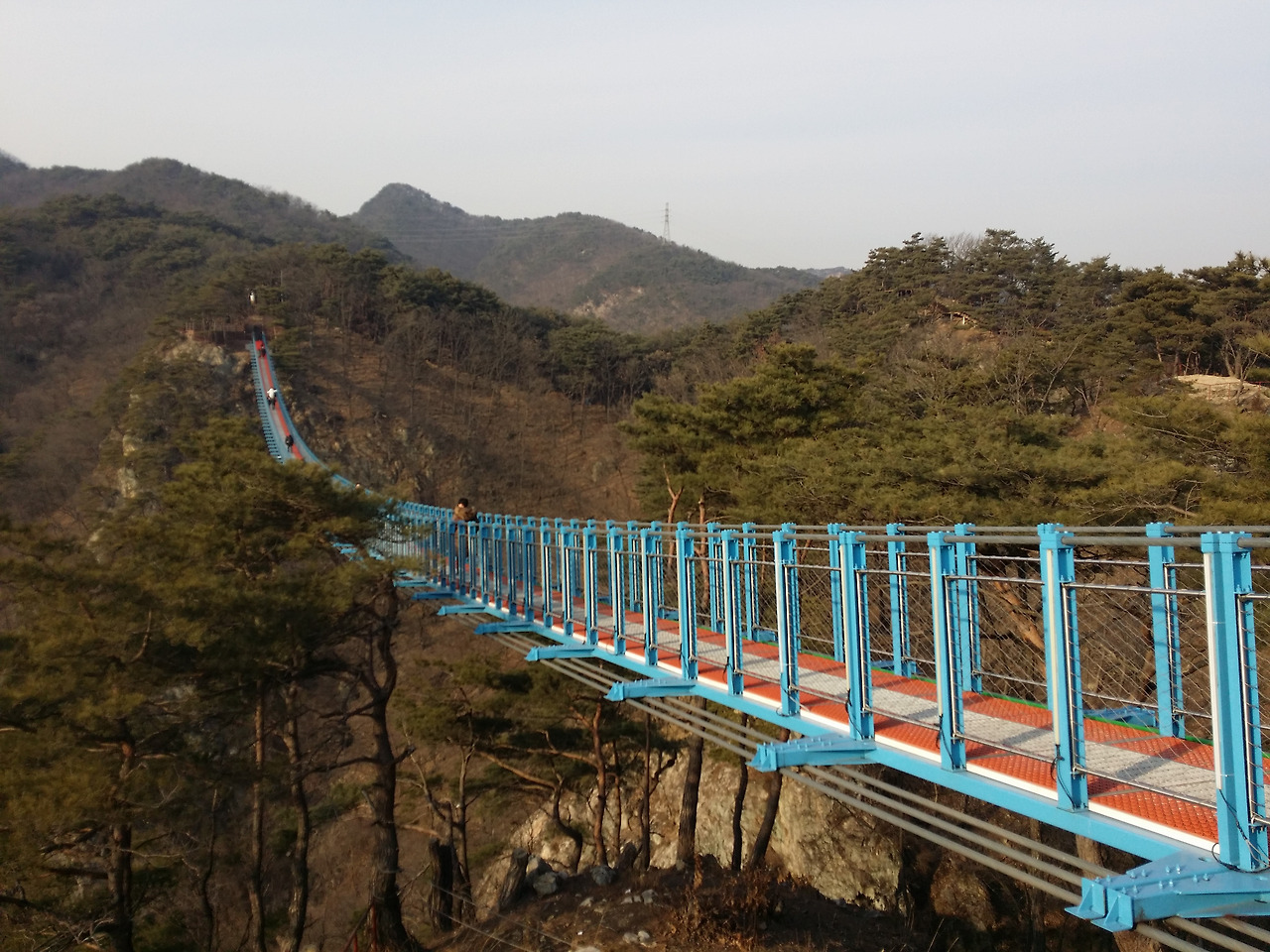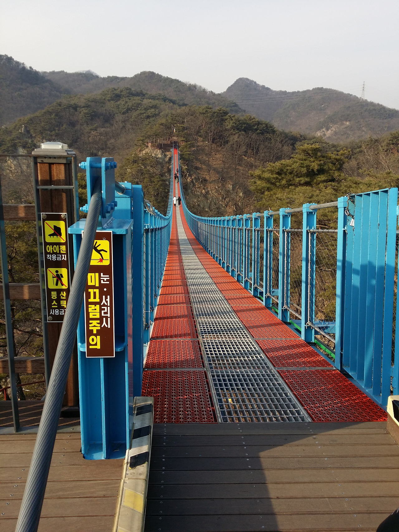 출렁다리는 생각보다 길었고, 출렁다리 아래 계곡은 생각보다 깊었다. 출렁다리의 바닥은 그물처럼 생겨서 아래가 훤히 내려다보였다. 까마득히 내려다보이는 계곡 위 허공에 내가 서 있었다.