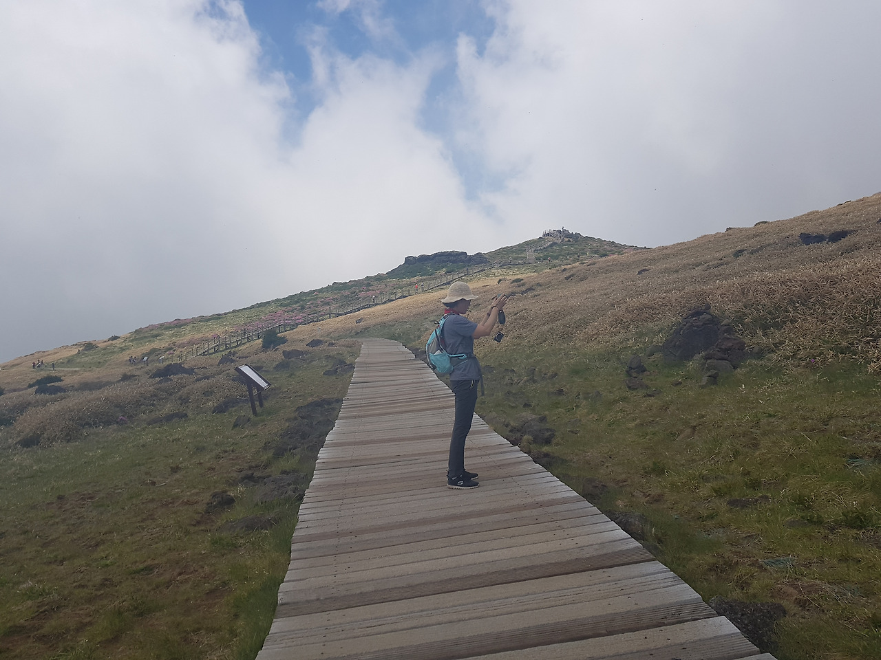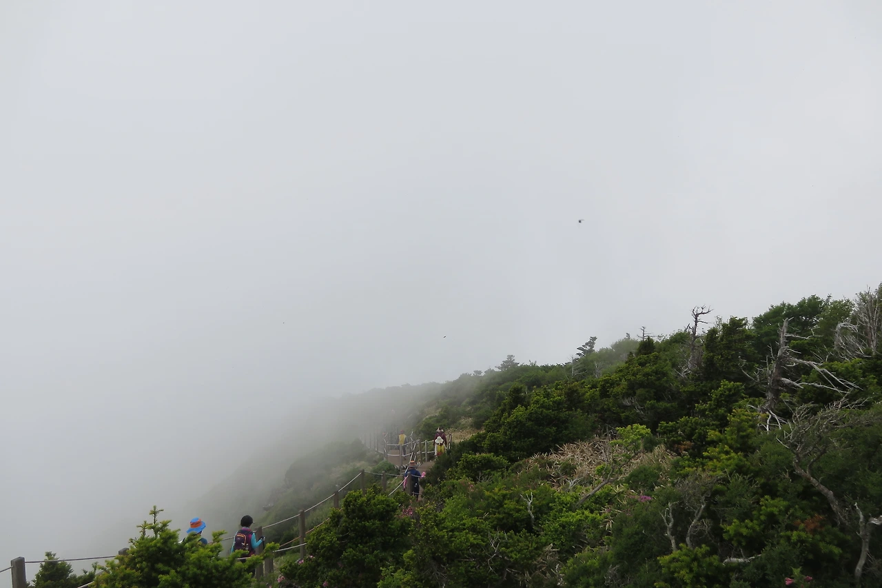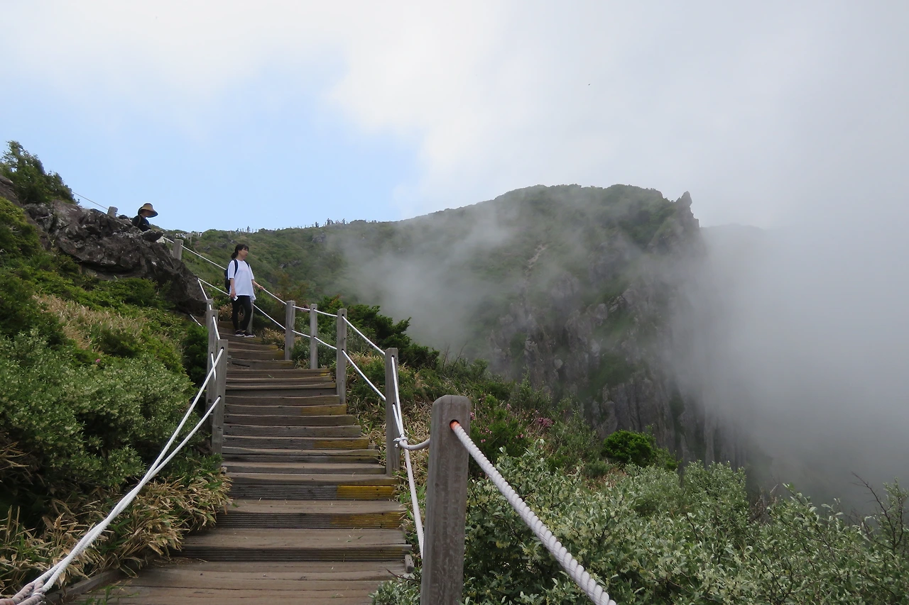 한라산의 날씨는 변화무쌍하다. 갑자기 몰려온 구름이 산을 뒤덮는다. 계단 까마득한 저 멀리 먼저 올라간 사람들의 실루엣이 보인다. 안개는 점점 짙어지고....