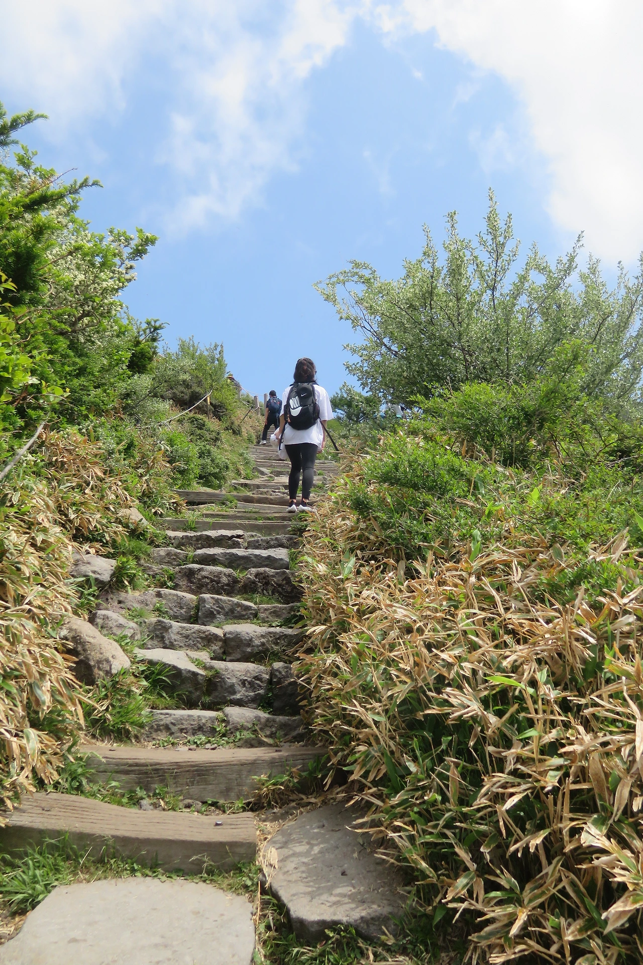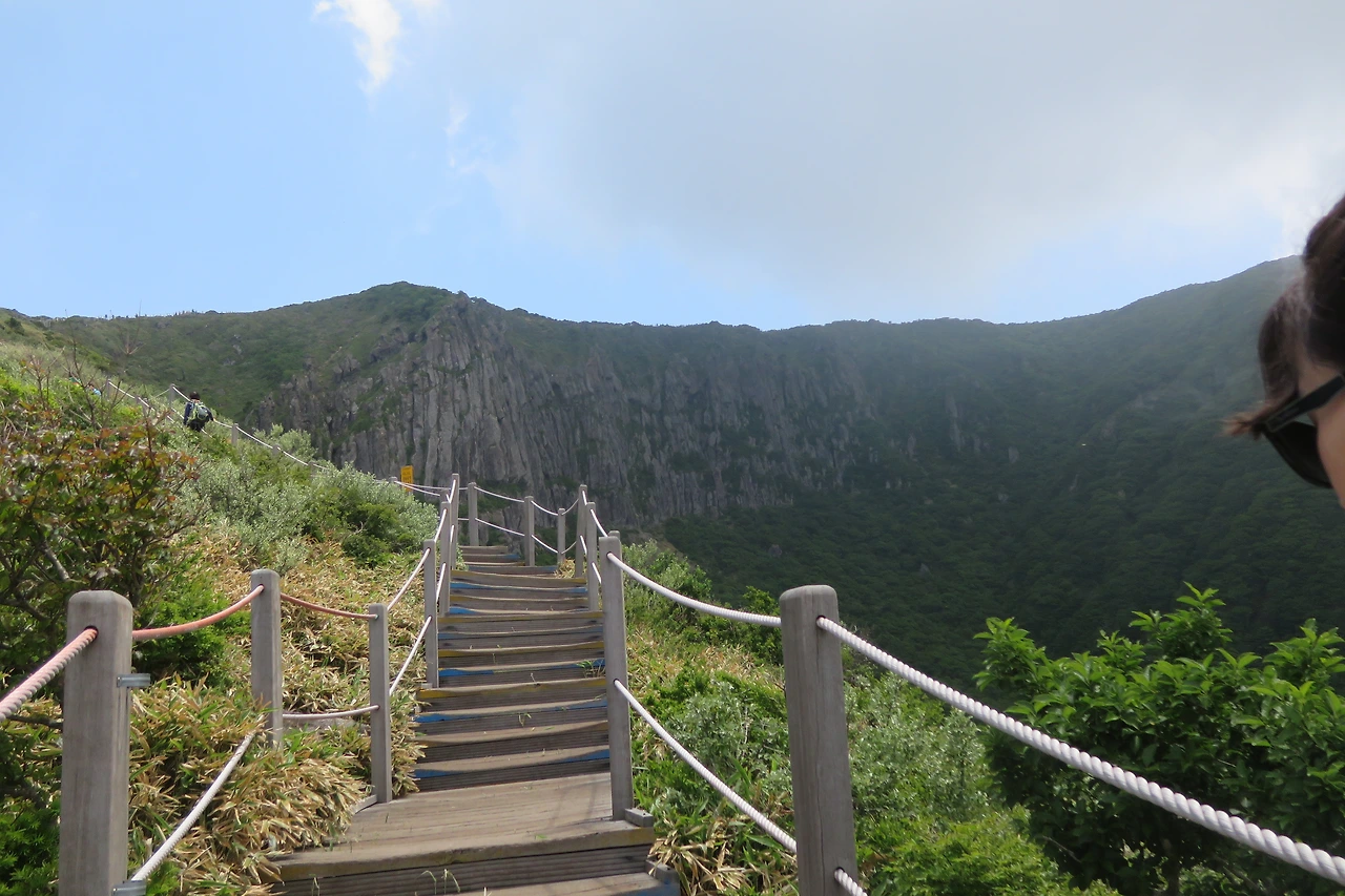 가파른 계단은 끝도 없이 나를 기다리고 있었다. 더러 돌계단도 있었으나 대부분 철도 침목같이 생긴 방부목으로 되어 있었다. 영실코스에서 가장 난코스라고 했다. 이 길을 거의 50분 가까이 오르면 병풍바위에 도착한다. 그런데, 인터넷에서 이 코스가 힘들다 글을 하도 읽어서인지 막상 계단의 끝까지 왔을 때 들었던 생각은 '고작 이 정도를 가지고 그렇게 겁을 먹었나?'였다. 이 말은, 인터넷의 글을 통해 계단에 대한 막연한 공포가 부풀려져서 스스로 실제 규모보다 더 크게 생각하고 있었다는 것이다. 어렸을 때 병원에서 주사를 기다리던 마음 같은 것이었다고나 할까. 막상 주사를 맞고 나면 아무것도 아니었던....
