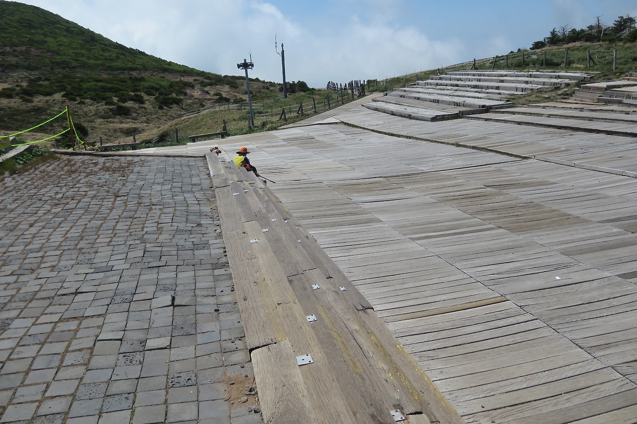 윗세오름에서 어리목으로 내려가다 보면 다시 넓은 평원을 만나게 된다. 만세 동산이란 곳이다. 우리는 만세 동산에서 철쭉을 심는 분들을 멀리서 만나게 되었다. 사실 나는 영실코스 철쭉이 야생인 줄만 알고 있었다. 그런데, 이분들 작업하는 모습을 보면서 이 많은 철쭉들이 세심하게 관리되고 있었다는 것을 알게 되었다. 만세동산을 내려가다 보면 모노레일 철로를 볼 수 있는데, 아마도 그것을 타고 한라산을 오르내리면서 철쭉을 돌보고 심는 등 관리를 하고 있는 것 같았다.