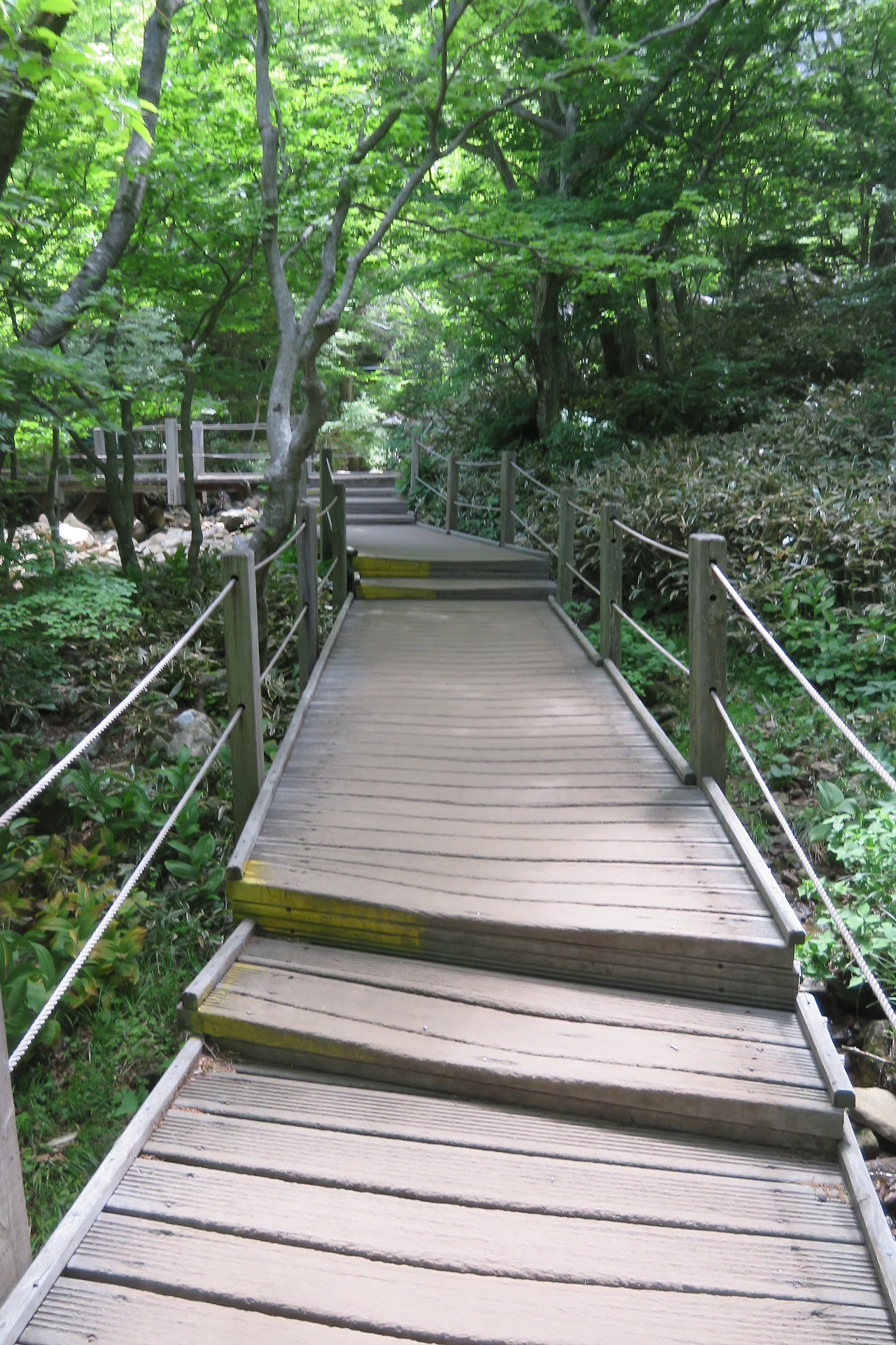 초입은 경사가 완만하고, 좌우로 물이 흐르는 계곡이 있는 데다 키 큰 나무 그늘이 져서 마치 산책하듯 즐겁게 지나갈 수 있다. 그러나 조금만 지나가면 급경사의 데크가 나온다. 인터넷에 미리 다녀온 사람들의 후기를 읽으면 이 난이도 상의 급경사 코스에 대한 이야기가 많이 나온다. 저질체력의 나로서는 긴장할 수밖에 없는 코스. 무리하지 말고 체력을 안배하며 천천히 올라가야 할 것이다.