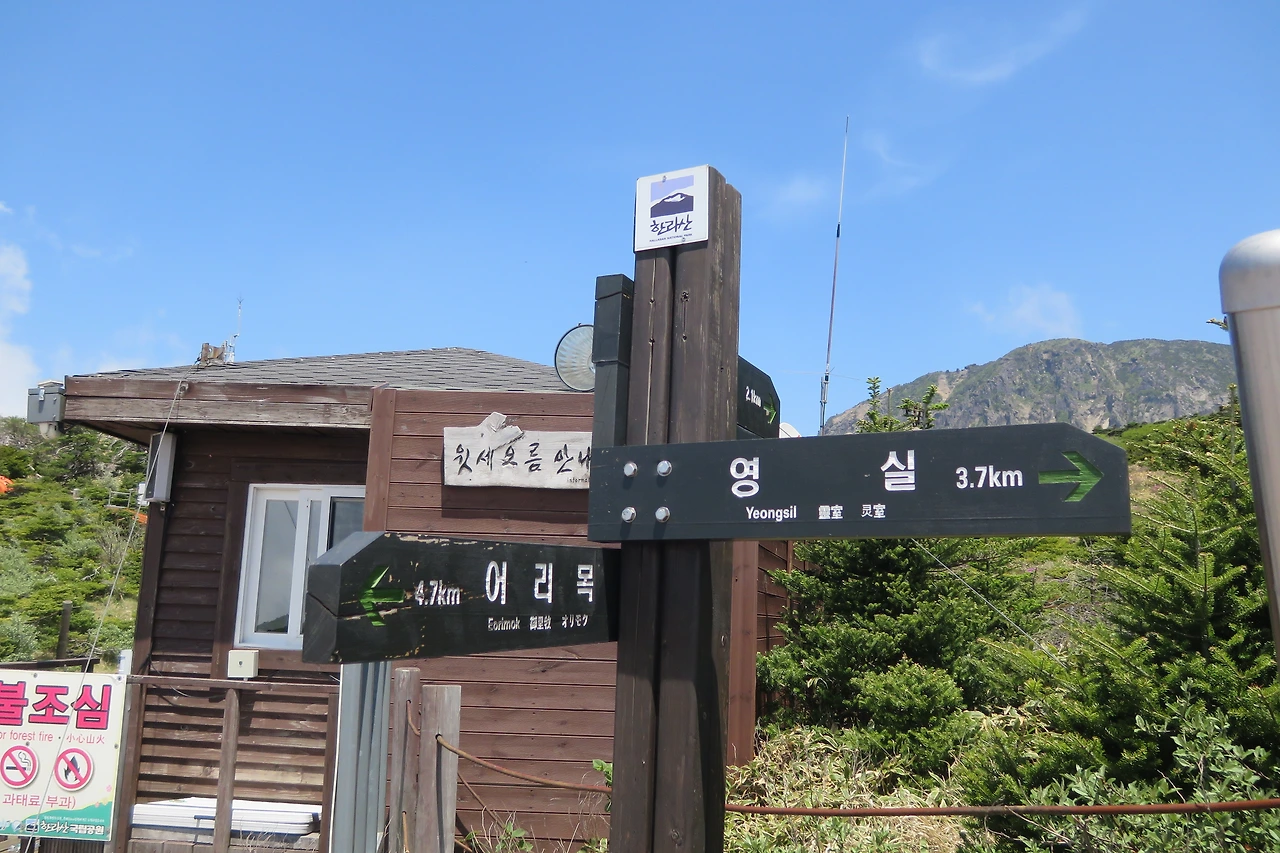 윗세오름 대피소의 매점은 홈페이지에서 확인한 대로 폐쇄되어 있었다. 우리 일행은 그 정보를 미리 확인해서 알고 있었고, 중간중간 쉬면서 열심히 가져온 간식을 먹었기 때문에 그다지 아쉽지는 않았지만, 매점 폐쇄 정보를 모르고 산을 오른 사람들에게는 낭패였을 것이다. 우리도 그런 분을 한 분 만나게 되었다. 나이 드신 남자분이었는데, 매점의 라면만 믿고 전혀 간식을 가지고 오지 않으신 것이다. 마침내 우리 배낭에는 넉넉한 간식이 들어있어 함께 나눠드렸다.