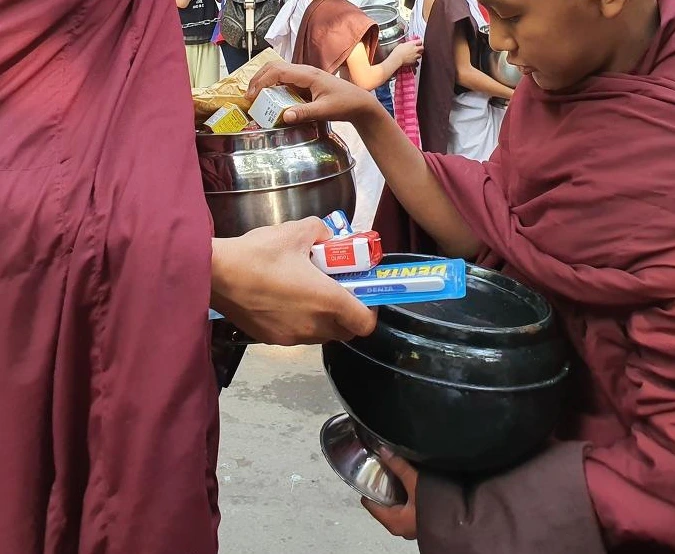 스님들은 매일 아침 10시가 되면 사원을 나와 식당으로 향하는데, 시간이 되면 자원봉사자들이 나와 스님들의 이동하는 통로인 도로 양 옆으로 관광객들을 통제하기 위한 줄을 친다. 관광객들은 인도에 줄지어 서서 스님들이 나오시기를 기다리며, 관리 요원들이 따로 있어서 관람하는 관광객들에게 예절 등을 안내한다. 예를 들어 핸드폰 카메라 촬영은 가능하지만 DSLR 카메라 촬영은 엄격하게 금지되어 있다. 스님들이 나오시면 관광객들은 미리 준비한 음식, 돈 등을 시주하기도 한다.