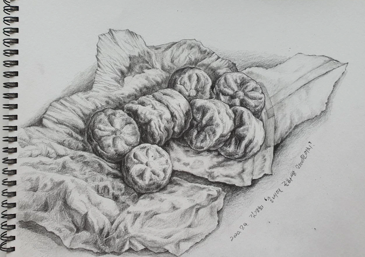 이천 원 8개, 작은 봉지 하나를 사서 집으로 돌아왔다. 피곤했던지, 잠시 누운 것이 일어나 보니 어느새 아침. 현관 장 위에 홀로 누워있는 국화빵 봉지가.... 미안한 마음에 세수도 안한채 봉지 한쪽을 주욱- 찢어 펼쳐놓고 하나를 집어 들었다. 식어도 맛있네. 우물우물 삼키다 문득 그림을 그리고 싶어 졌다..... '송내역 국화빵, 이천 원어치'