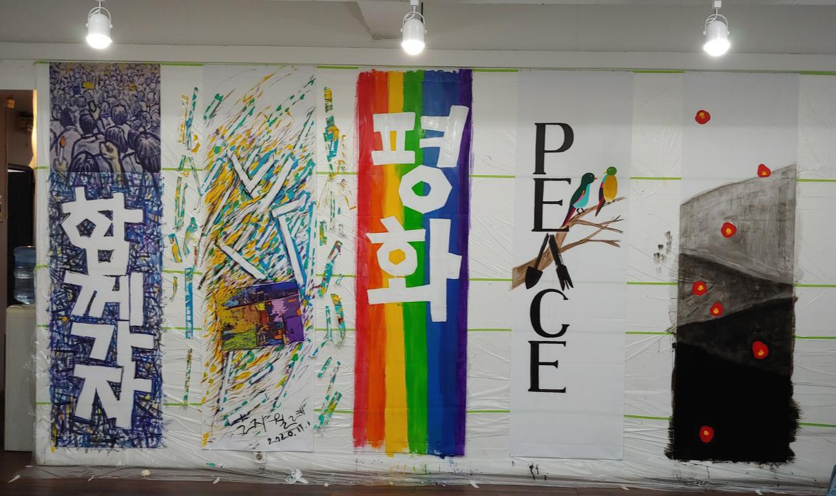 내가 회원으로 있는 인천민족미술인협회에서는 다양한 방식으로 이 축제에 참여해왔는데, 올해는 만장 작업을 한다고 하여 나도 함께 하게 되었다. 회원들이 평화와 관련 있는 문구나 그림을 구상해와서 긴 플래카드에 쓰거나 그리는 작업이었는데, 나는 평화란 글씨를 나름 해석하여 그리게 되었다. 평화를 위협하는 전쟁, 기아, 차별, 무기와 같은 단어들이 글씨의 끝에서 잡아당기고 있고, 부서지는 글씨 한쪽 획을 잡고 어린이들이 위태롭게 매달려 있는 내용이었다. 내 몫의 만장을 다 그리고 나니 플래카드 하나가 여유분으로 남게 되었다. 아직 다른 회원들이 작업을 마치지 않은 상태라 내가 그곳에 평화란 글씨를 쓰게 되었다. 종이테이프로 글씨 부분을 덮고, 배경을 무지개 색으로 칠하게 되었는데, 내가 하는 것을 바라보고 있던 회원 한 분이 '왜 무지개 색'이냐고 물어오셨다. 사실, 내가 무지개 색을 고른 데는 무슨 이유가 있는 것이 아니었다. 예쁘지 않은가? 빨주노초파남보 일곱 가지 색은 어떻게 칠해도, 물감이든, 색연필이든 어떤 재료로 칠해도 예쁘다. 거기에 무슨 이유가..... 생각하다가 문득 짚이는 것이 있었다.