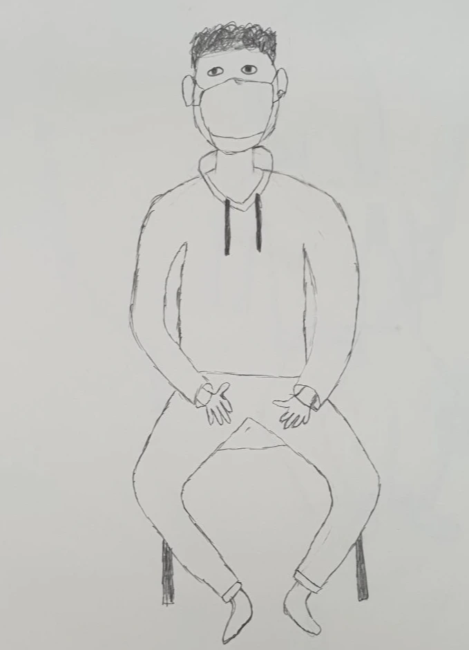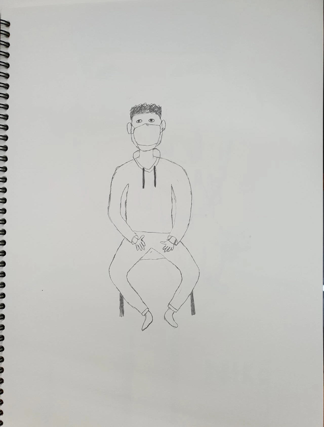다음 그림은 구도틀을 사용해서 그렸다. 위의 전신을 그린 그림과 비교해보자.(같은 학생이 그린 그림이다.) 인물의 배치는 물론 대상의 사실적 재현에도 좀 더 성공한 듯 보인다. 구도틀을 사용한 쪽이 표현 의도를 분명히 할 수 있기 때문에 관찰에도 도움이 되는 것 같이 보인다. 구도틀은 그림을 그릴 때마다 쓸 필요는 없다. 몇 번 사용하다 보면 마음 속에 보이지 않는 구도틀 하나쯤은 그냥 만들어질 것이기 때문이다.