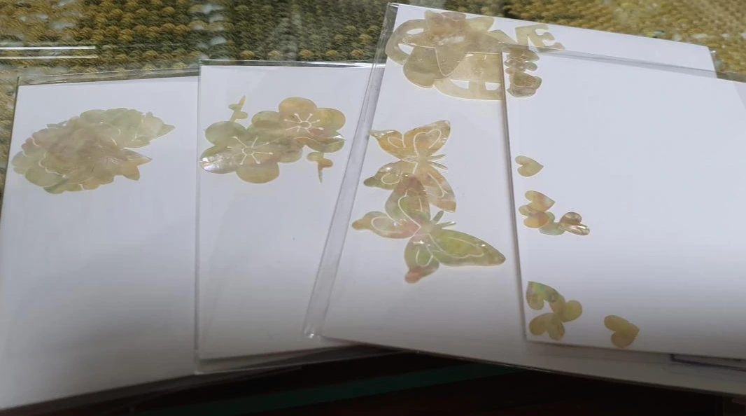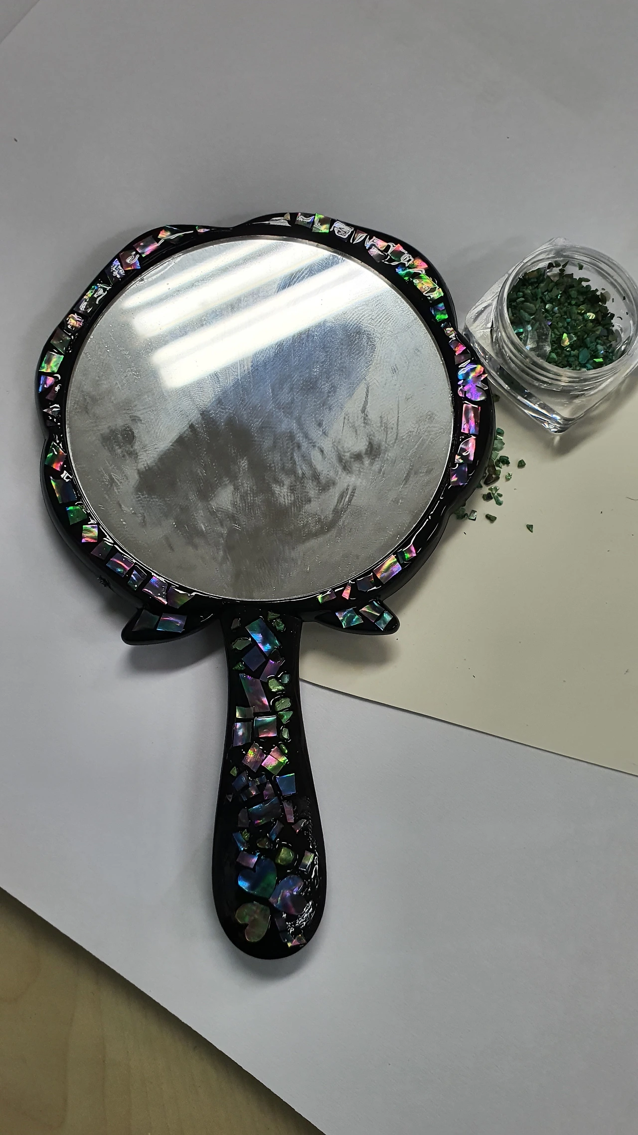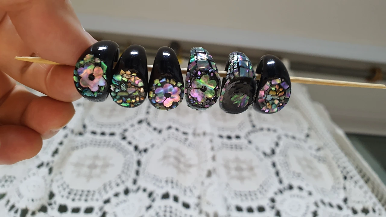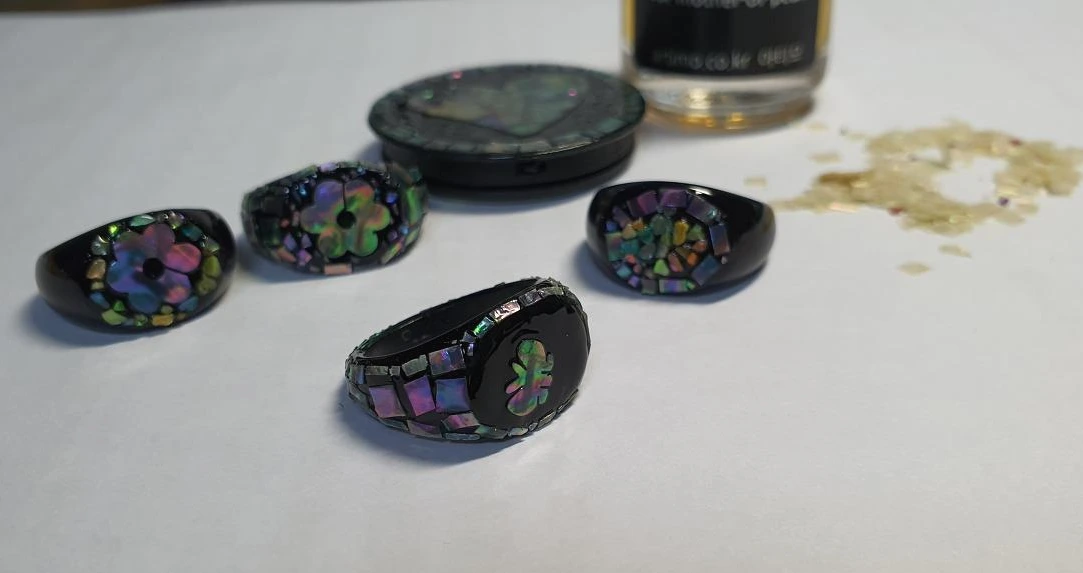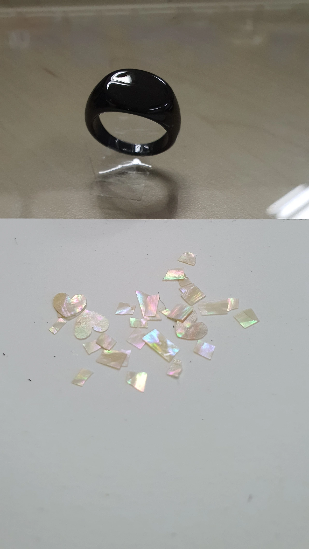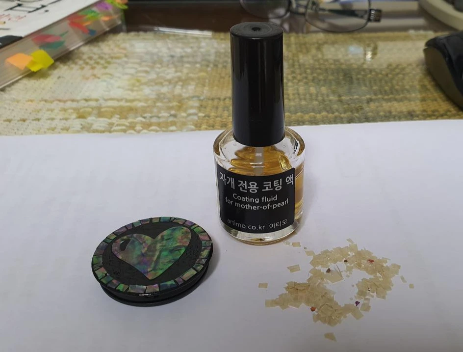 참 신기하다. 하얀 자개쪼가리에 코팅액을 바르면 무지개빛 황홀한 빛을 발한다. 저렴한 플라스틱 반지가 럭셔리 전통공예 반지로 변신! 우측 플라스틱 거울도 아주 저렴하다. 반지의 경우 업체가 물량을 확인도 않고 판매하는 바람에 한바탕 소동을 겪었다.