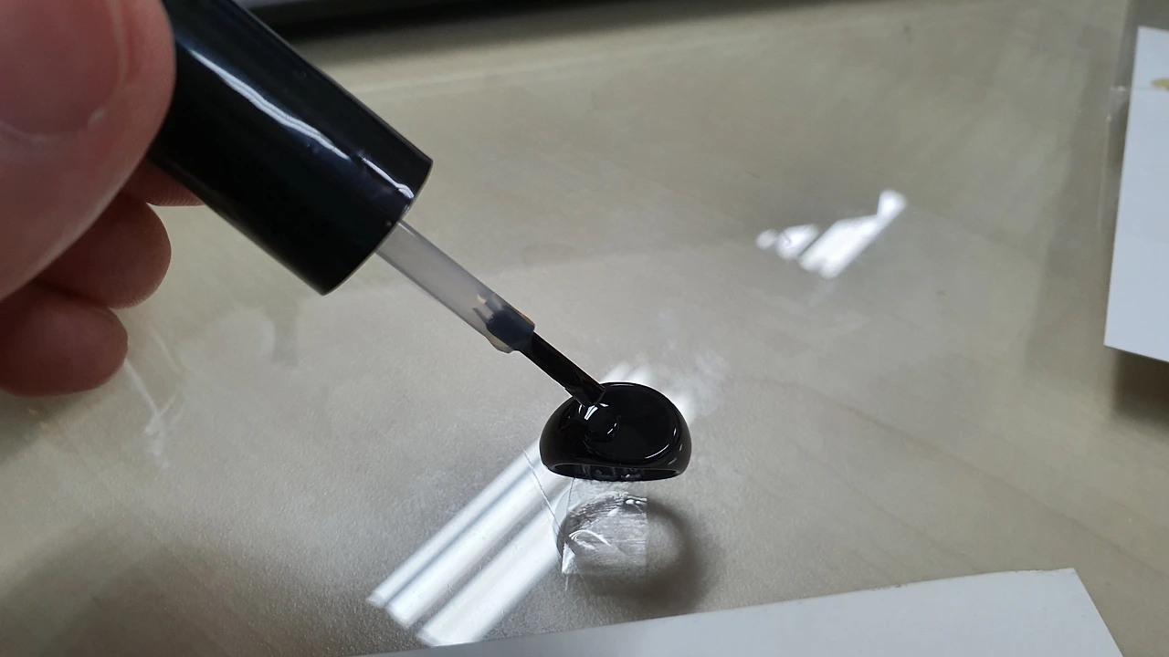 반지를 스카치테이프로 책상에 고정시키기->코팅액 바르기->자개 바르고 코팅액으로 광택 주기 일과가 끝나고 아이들이 귀가하고 여유가 생겨 한숨 돌린 후 아이들이 실습하고 남은 자투리 자개로 나도 반지와 그립톡을 만들어 보았다.