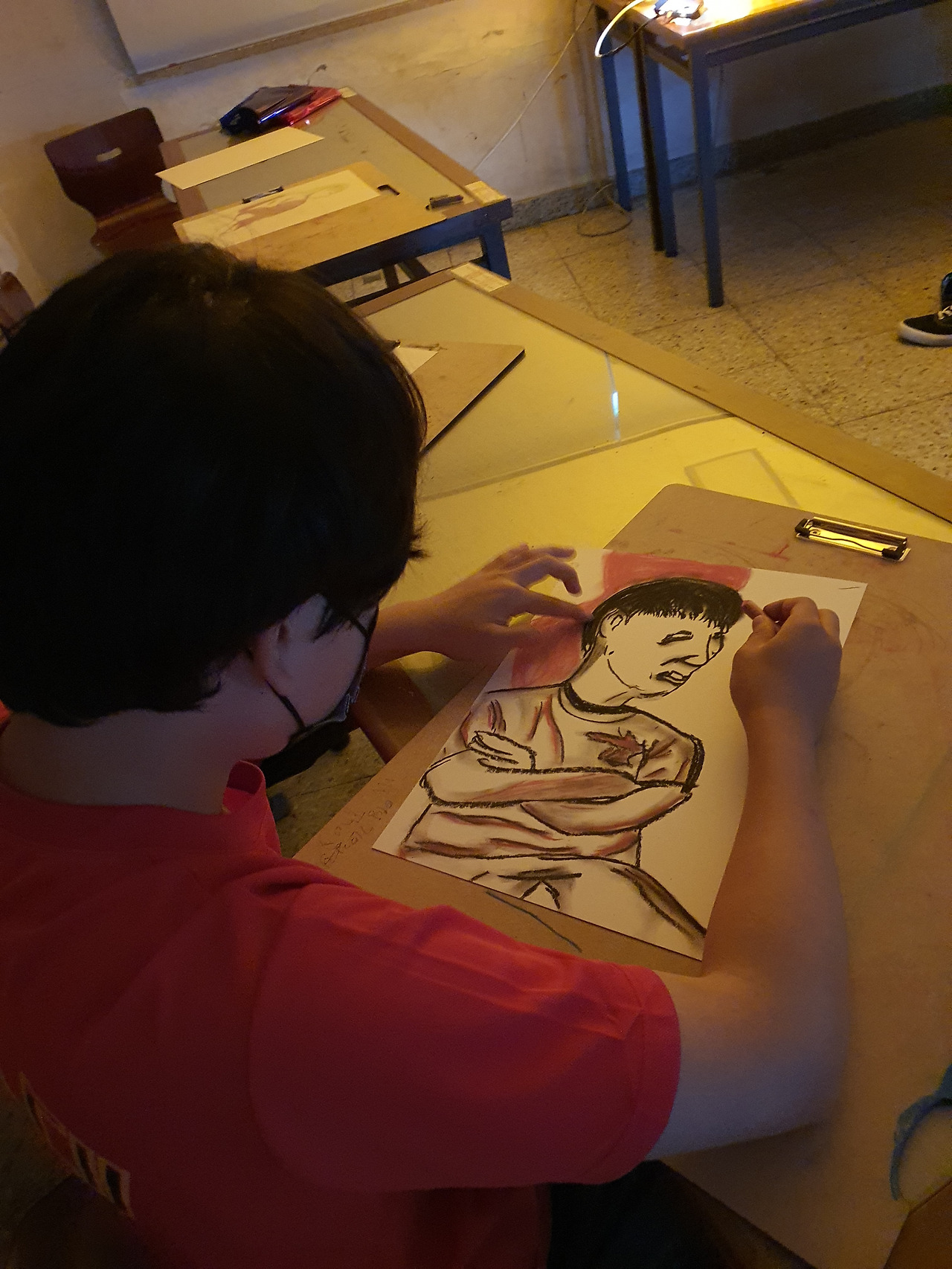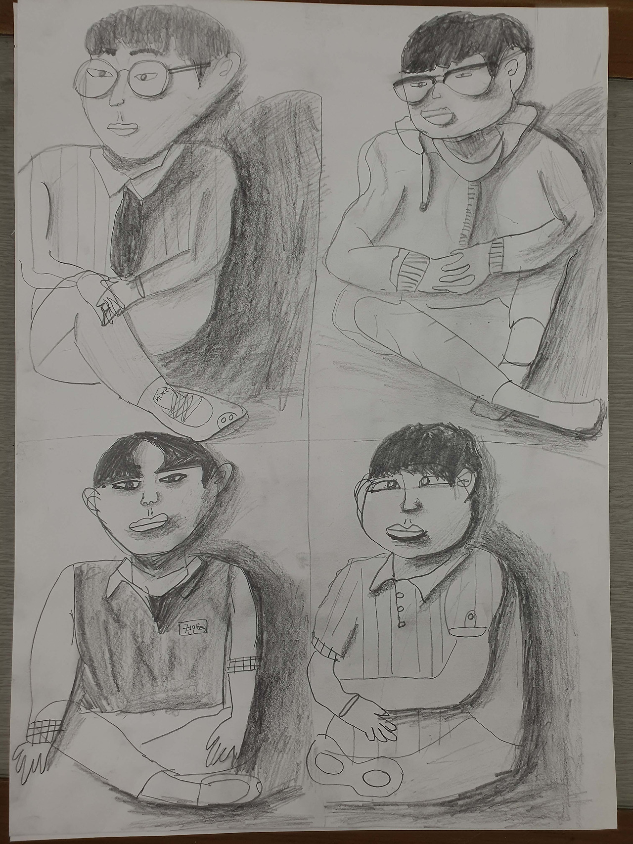 C는 수행평가 과제 설명을 듣자마자 도화지를 네 구역으로 나눴다. 각 칸에 네 명의 모델을 꽉 채웠으며 인체 비례조차 무시했다.