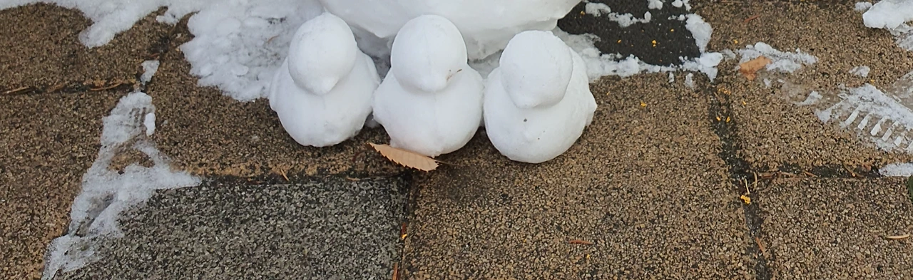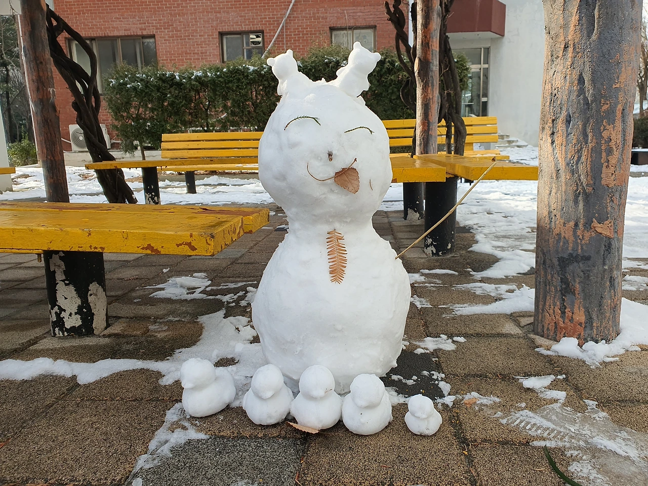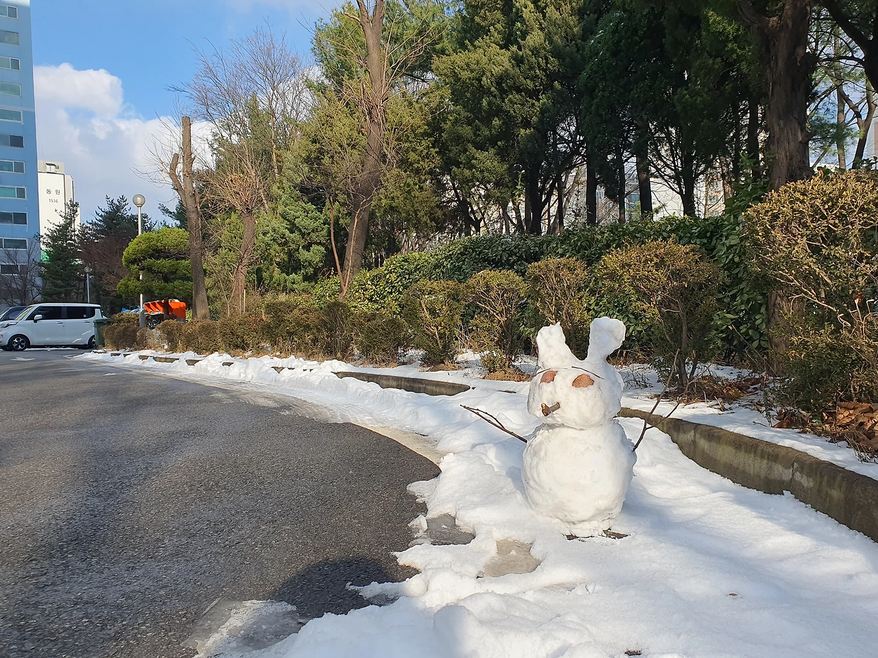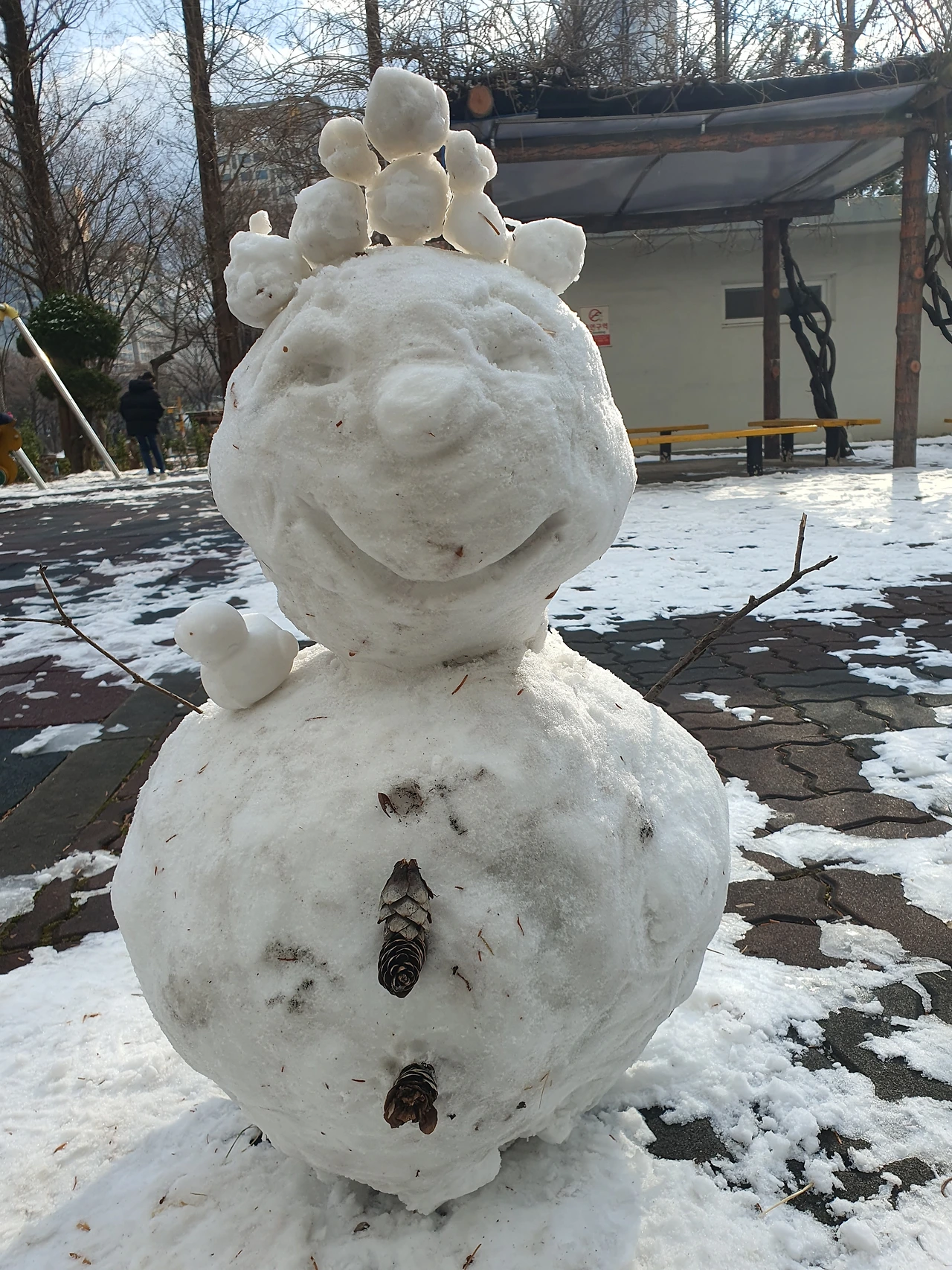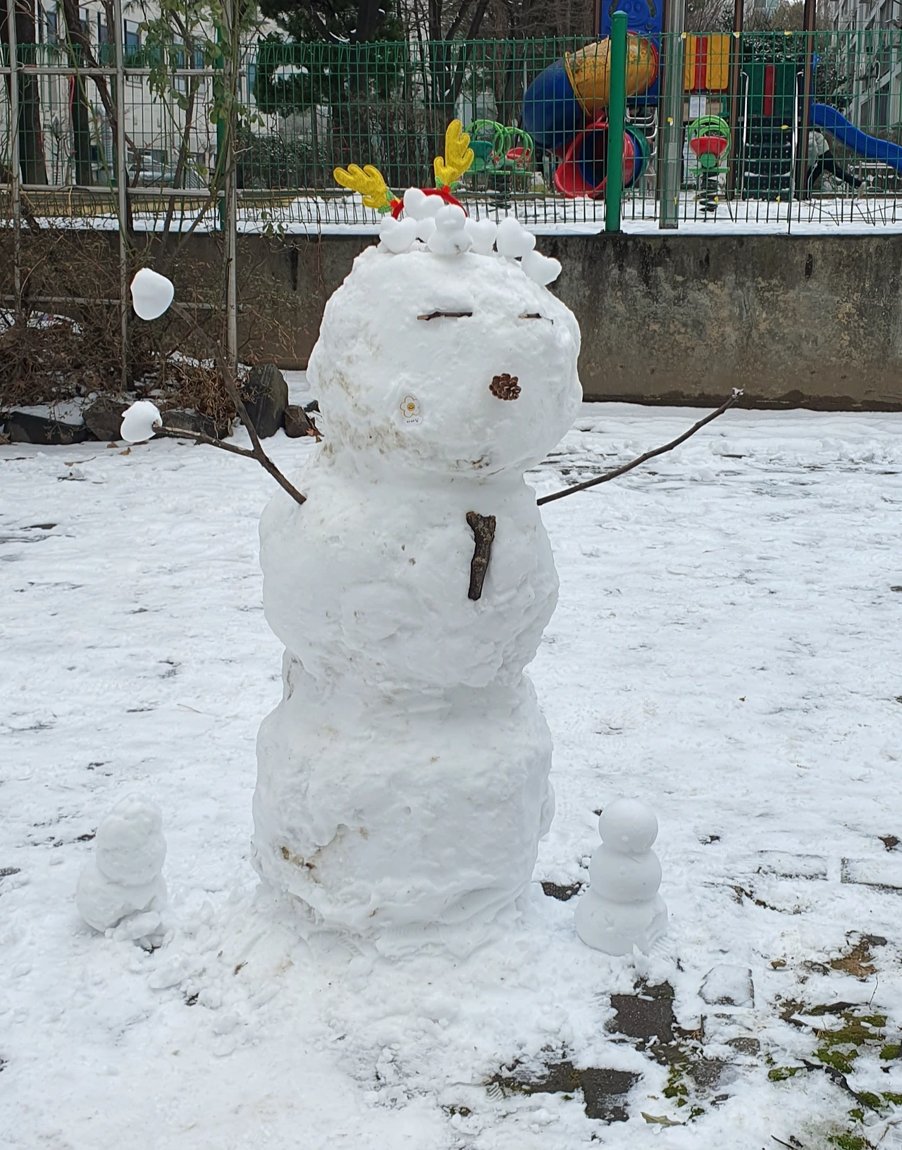 세 마리에서 다섯 마리로 늘어난 눈오리. 엄마와 눈오리를 만들고 있던 어린 자매가 내가 사진 찍는 것을 보더니 만들고 있던 눈오리를 슬그머니 눈사람 밑에 놓아주었다.