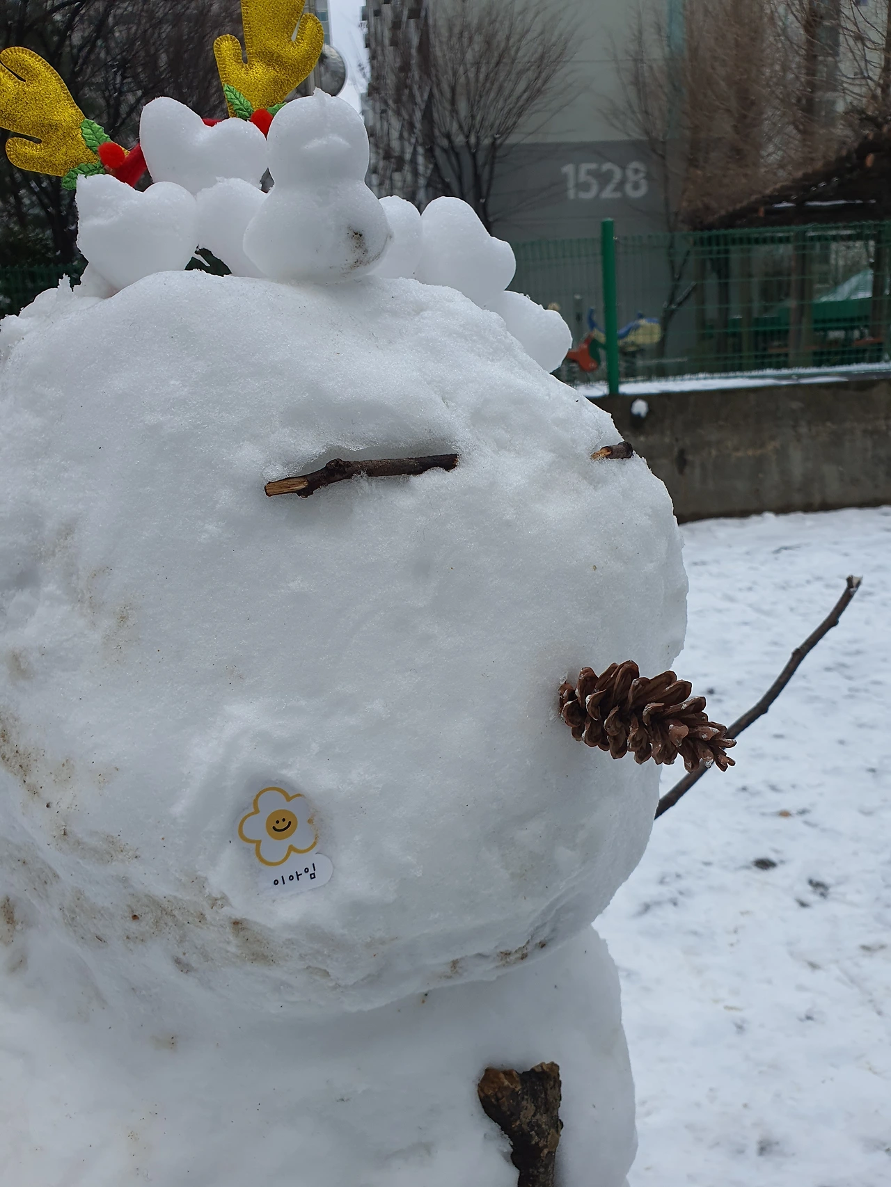 루돌프 뿔의 삼단 눈사람. 이건 울라프가 분명해! 눈사람 볼에 붙어있는 스티커는 눈사람을 만든 어린이의 이름일까?