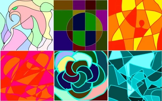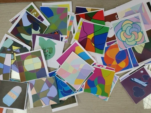 아래 이미지들은 기초 수업 시간에 배색 실습한 결과들이에요. 유사색, 반대색, 명도가 높은 색 등 다양한 조합으로 배색을 하면서 느낌 차를 보는 거예요. 두 시간에 각각 네 장에서 여섯 장의 배색 이미지를 만들었죠. 이 과정이 충실하게 이루어진다면 어떤 영역에서든, 가령 회화든 디자인이든 배색을 적용할 수 있을 것이란 생각을 했거든요. 아이들도 생각보다 이미지를 잘 만들어서 이걸 바로 다른 수업으로 연결했으면 더 좋았을 거란 생각을 뒤늦게 했어요.
