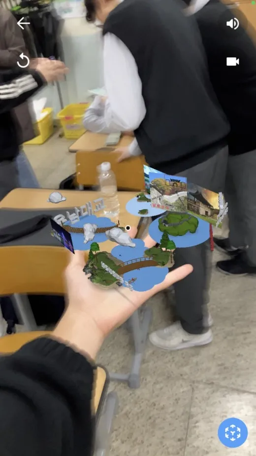 아래 동영상은 증강 현실로 체험하는 짧은 영상이에요. 미술실 책상 위에 짠~ 하고 내가 디자인한 가상공간이 펼쳐지지요. 아이들도 나도 와! 감탄을.... ㅎㅎ