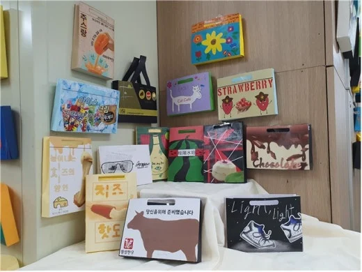 마지막 시간에는 출력해서 진짜 쇼핑백으로 만들었어요. 태블릿 속의 디자인을 현실로 끄집어내고 싶었거든요. 완성 후 미술실 벽에 붙이면 끝! 이러면 전시와 제출이 한꺼번에 해결되지요.