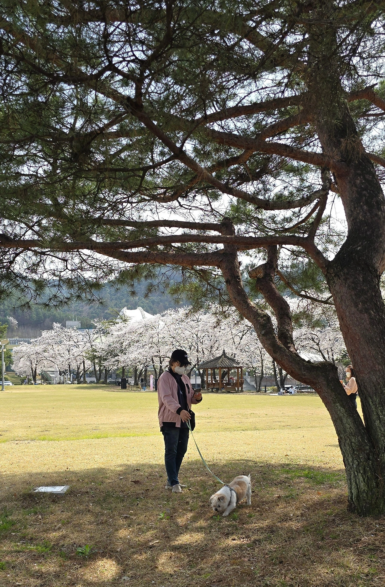 아침 공기가 시원하다. 이틀 전만 해도 추웠는데 이른 아침인데도 포근하다. 이곳에도 벚꽃은 지천이고 풀 숲 사이 보라 제비꽃, 노란 민들레, 냉이꽃도 지천이다. 온 세상이 한꺼번에 봄이라고 외치는 것 같다. 듬직한 하반이는 걷고, 장화 신은 장화는 촐랑촐랑 이곳저곳 기웃거리다 이내 쏜살같이 내달렸다 멈춰 서기를 반복한다. 좋은 기운이 마음에 충만해진다.