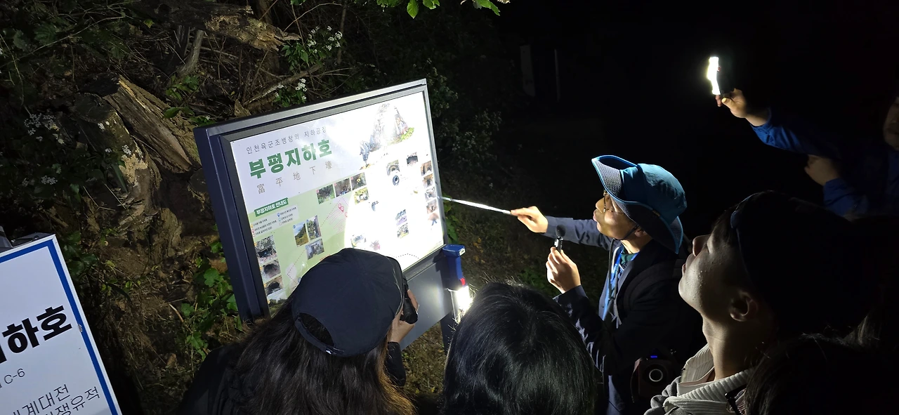 부평지하호는 총 29개 정도가 확인되었다고 한다. 그중 c구역에 있는 지하호의 입구 지난 210월 26일, 부평 지하호 달빛 기행에 학생들과 함께 참여하게 된 것은 같은 학교에 근무하는 사회 선생님 덕분이었다. 부평문화원의 달빛 기행은 [2024 기억하라 부평지하호] 탐방 프로그램으로, '일제강점기 인천육군조병창의 지하공장인 부평지하호를 직접 걸으며 '아시아 태평양 전쟁유적'을 체험해 보는' 프로그램이다.(이하 따옴표 안은 부평지하호 팸플릿에서 인용했다.) 탐방은 한 달 한 번 진행되는데, 산곡동 인평고등학교 인근 구세군 어린이집 앞 공터에서 시작한다. 함봉산 산길을 따라 걸으며 부평 지하호의 흔적들을 답사하게 되며 c구역 6번 지하호 150m를 탐방하는 것으로 끝난다. 전체 탐방 시간은 대략 한 시간 30분 정도. 부평지하호는 대부분 사유지나 군부대 지역 안에 있어서 개인적인 접근은 어렵고, 부평문화원의 탐방 프로그램을 통해서만 방문할 수 있다. 전체 탐방은 부평문화원 문화 해설사님의 안내로 진행된다.