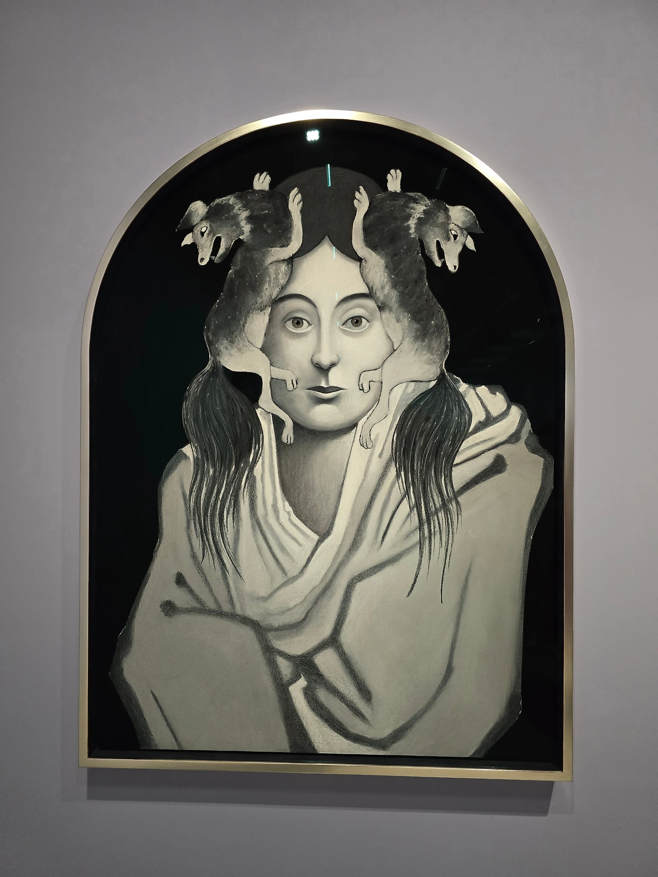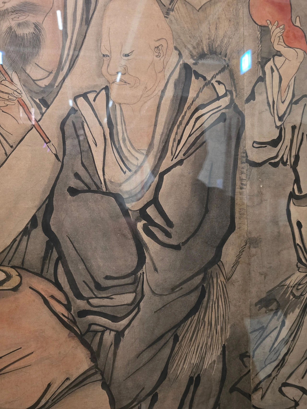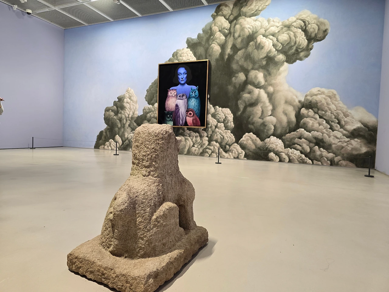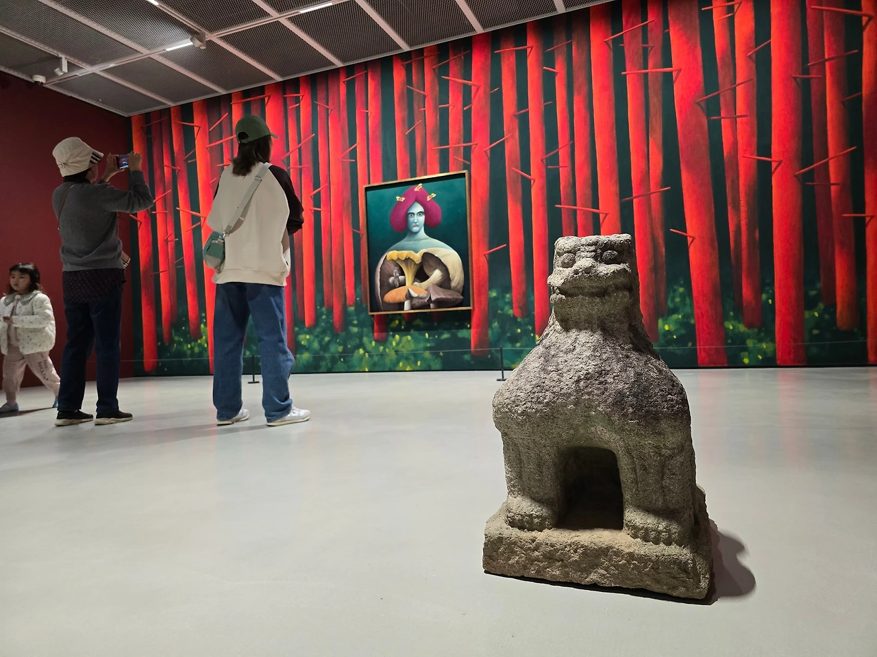 눈높이를 낮춰 석물의 위치에서 작품을 바라보면 어떨까? 석물과 작품이 같이 전시된 곳이 있는데, 하나는 작품을 등지고, 하나는 작품을 바라보게 설치했다. 뭔가 의도가 있긴 하겠지. 하지만 꼭 작가의 의도를 알아야 전시가 재미있는 건 아니다. 서있는 눈높이를 낮춰 석물 옆에 앉아서 그림을 감상해보자. 그러면 작가의 의도도 더 잘 보일까?