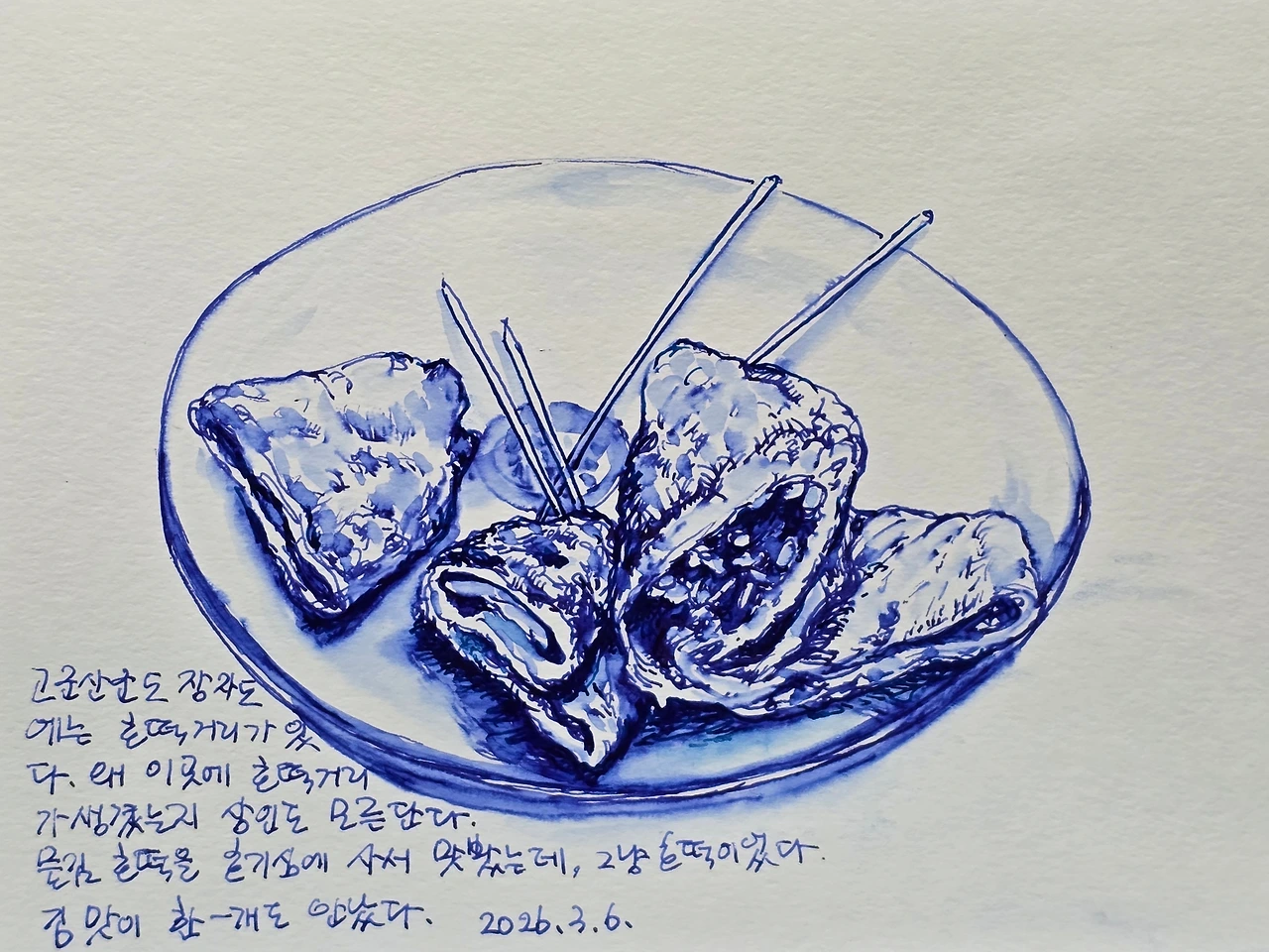 선유도와 장자도 사이에는 스카이워크가 있어 걸어서 바다를 건너갈 수 있다. 하지만 친구도 나도 바닥이 보이는 높은 다리를 별로 좋아하지 않아서 구경만 했다. 주차장으로 돌아오는 길, 물김호떡 플래카드를 보게 되었다. 위치를 찾아보니 장자도 쪽이었다. 희한했다. 주차장을 중심으로 호떡집이 줄지어 있다니. 물김호떡과 일반호떡을 하나씩 주문해 봤다. 상인에게 '이 동네에 왜 이렇게 호떡집이 많은지'물어봤다. 상인도 모른단다. 한 집이 잘되니 그 옆집이 생기고, 또 생기고 한 것 같단다. 차별성을 만드느라 호떡에 물김도 섞고 구어놓은 호떡에 매생이 김도 묻혀서 파는 모양이다. 어쨌든, 군산 앞바다 고군산도의 장자도에는 호떡거리가 있었다.