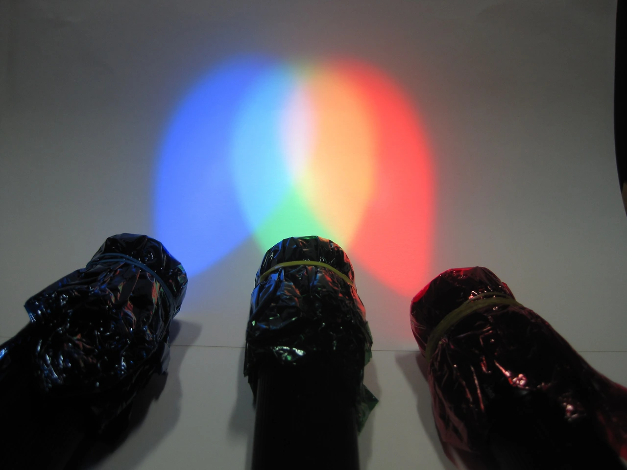그래서 빛의 삼원색이 빨강, 파랑, 녹색이라는 것을 알고 있으며, 이 세 가지 색을 섞으면 흰색이 된다는 것을 또한 알고 있다.