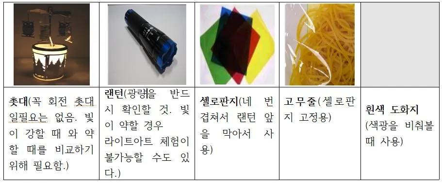 몇 번의 구입과 반품 끝에 최종 낙점된 것은 한 업체의 자전거용 랜턴이었는데, 줌인 아웃도 되는 모델이라 빛의 크기와 광량이 조절되는, 결과적으로 보면 수업을 위한 랜턴으로는 아주 최상의 모델이었다. 여기에 추가 보충용 건전지와 셀로판지를 10세트 따로 구입했다. 셀로판지는 빛의 삼원색을 구현하기 위한 것으로, 셀로판지를 네 겹으로 겹쳐 고무줄로 고정했다.