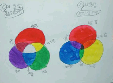 빛의 혼합과 관련된 수업 사례를 찾기란 쉬운 일이 아니다. 가끔 전시회에서 빛 체험 부스를 설치한 경우는 볼 수 있었지만 실제 학교에서 이루어진 수업 사례 찾기는 쉽지 않았다. 관련 수업 사례 찾기가 얼마나 어려운 가는 아래 사지을 보면 알 수 있다. 색의 혼합을 학습한 결과물을 찍은 사진에서, 빛의 삼원색을 표현한 다이어그램을 그리고, 그 안에 물감을 칠하고 있다. 하지만, 이 수업은 물감의 혼합 수업이지 빛의 혼합이라고 할 수 없다. 빛의 혼합 수업이라면 실제로 빛을 혼합해야 하는 것 아닐까.