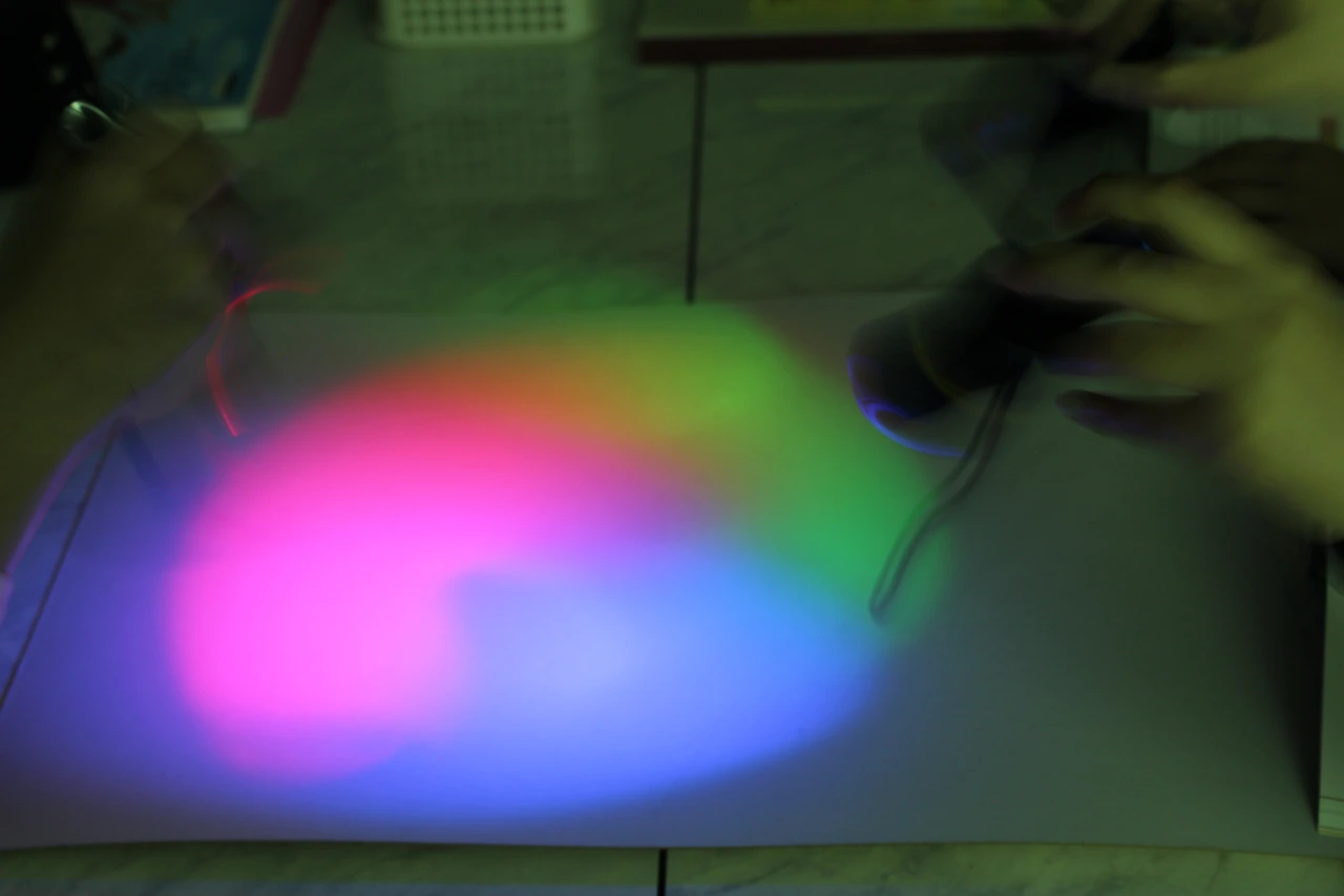 흰 종이 위에 실험을 해본 결과 아주 만족스러운 결과를 얻을 수 있었다. 세 가지 색의 빛을 섞으니 흰색이 나온다!!! 우와, 진짜 된다!!!!