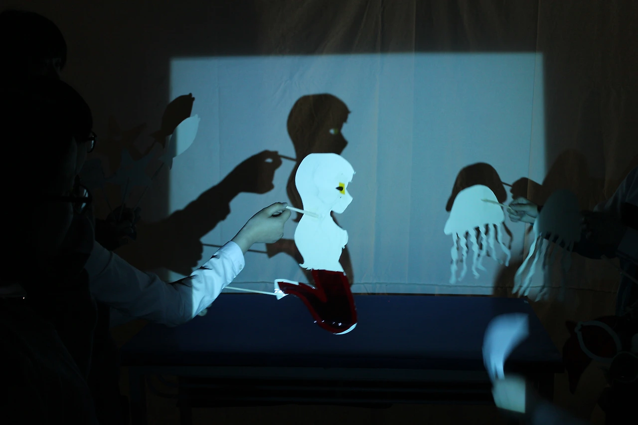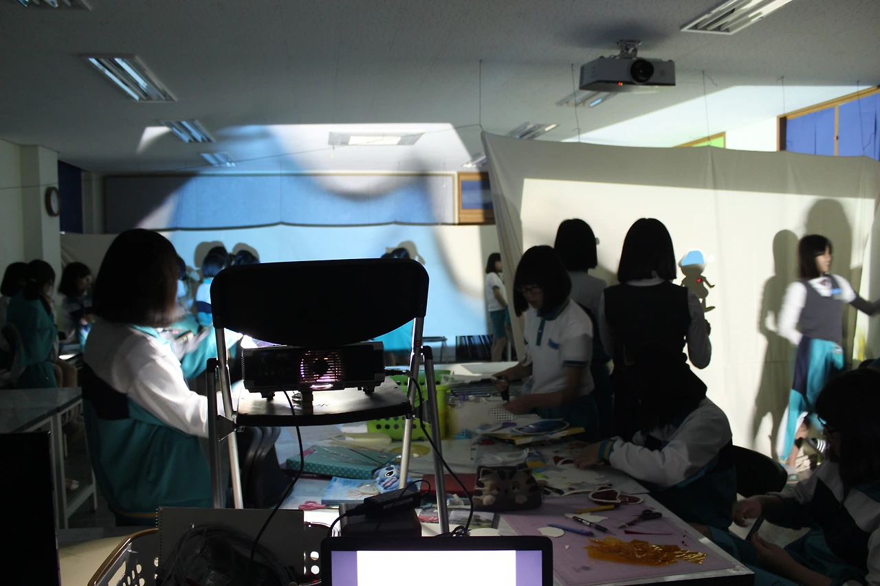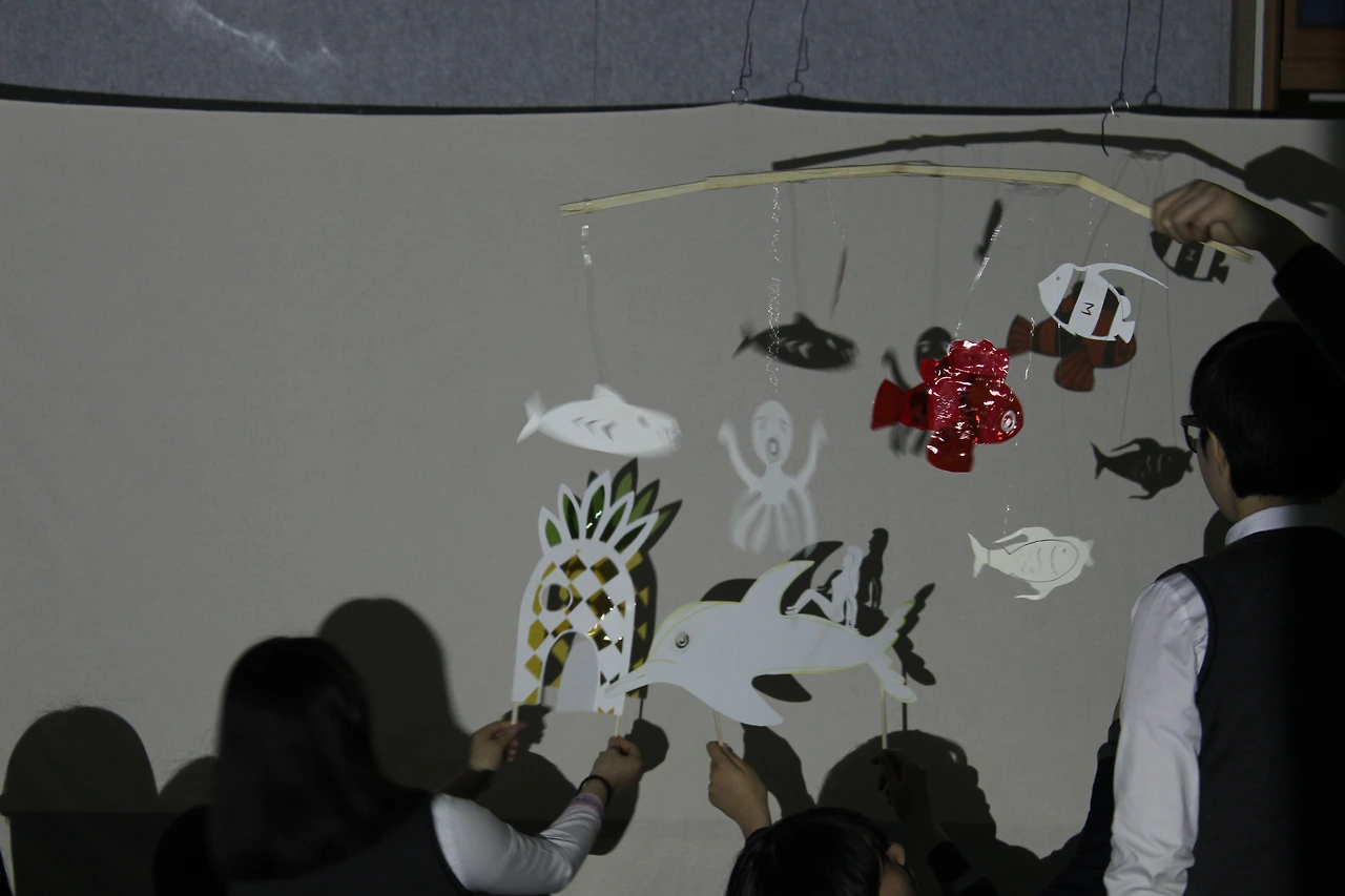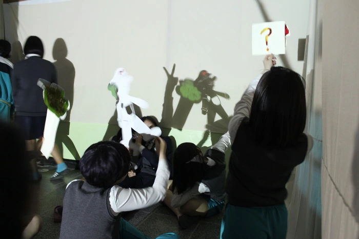 - 1-2차시: 빛과 색(빛의 혼합) 이론과 라이트아트 체험. 수업 정리단계에서 그림자극에 대한 힌트를 주고 모둠을 구성한다(모둠별 6-8명 내외) 모둠이 정해지면 어떤 내용과 형식으로 그림자극을 진행할 것인지에 대해 의논한다.